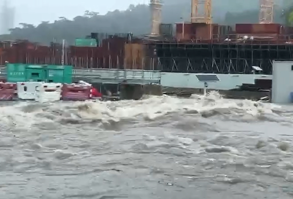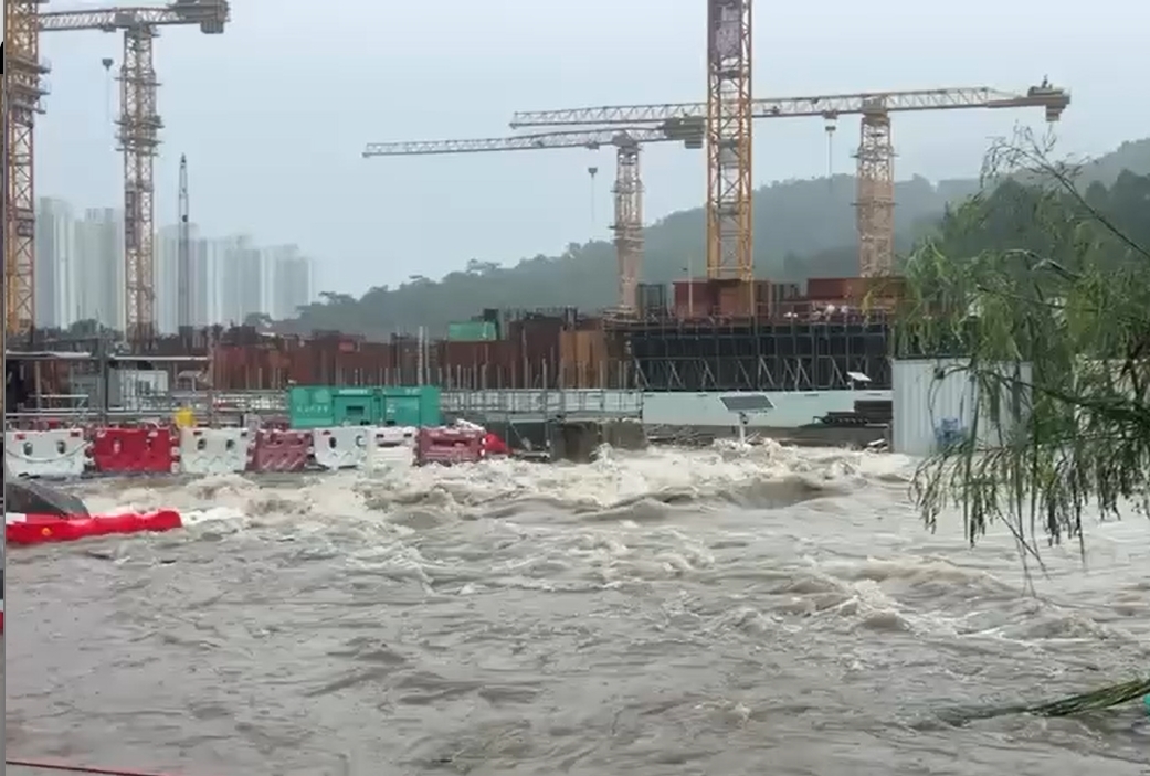 事發時間相信是今天黑雨期間,地點相信是東涌北的石榴埔地盤,視頻可見涉事地盤當時完全被水淹浸,彷如「大海大浪」,現面十分誇張。