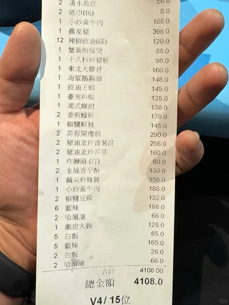 從收據上可見,該桌共點選多道菜式及酒水,另加白飯與紙巾,總消費為4108港元,平均每人約274港元。但細看之下,收據列明有十二碟「辣椒豉油」,每碟10港元,合共120港元。樓主坦言,即使多次來港,仍難以理解這種收費方式。