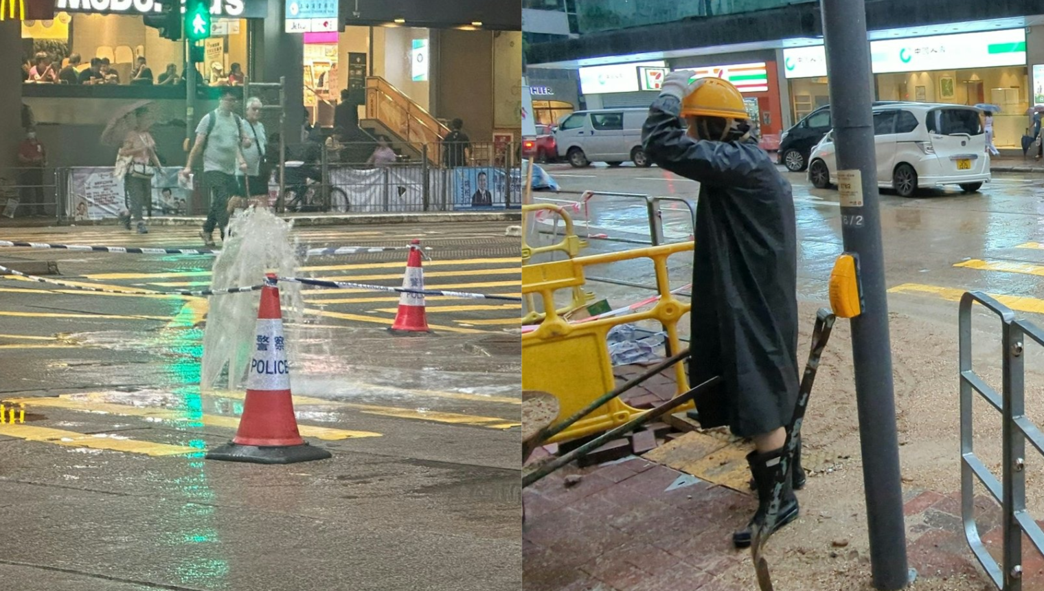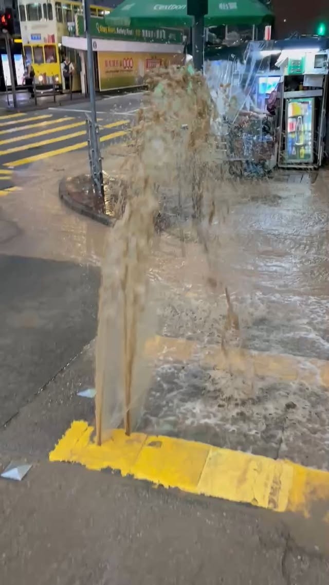 今日清晨大約6時,灣仔軒尼詩道311號誌寶大廈對開行車路有地底水管爆裂,如小噴泉般湧出路面,受影響面積約3米乘5米。