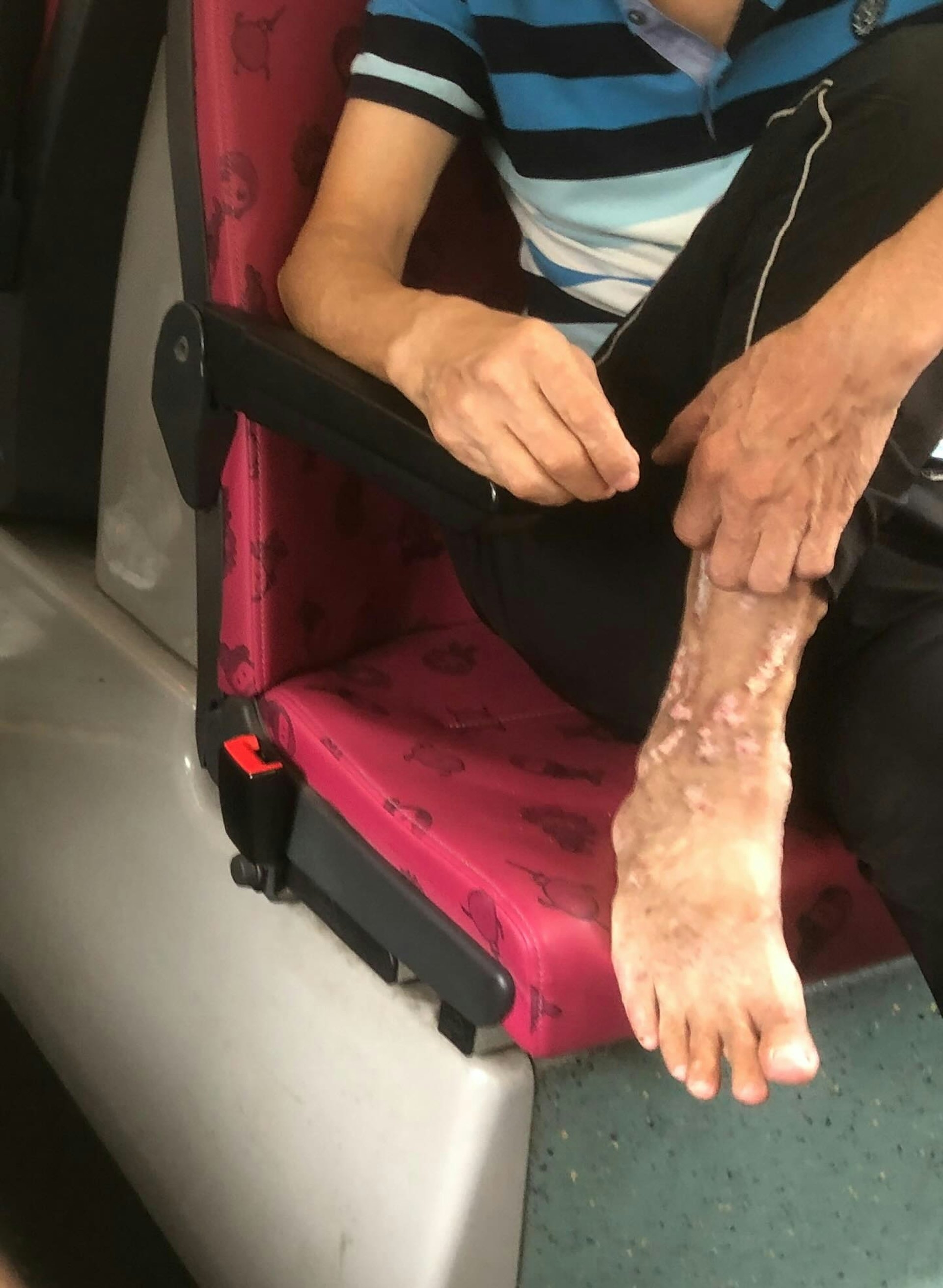 網上社交平台近日流傳一則帖子並且附上圖片,指出九巴車廂內一名滿腳巨瘡的阿叔,當眾脫鞋放座上搣腳皮,皮屑散佈座位,導致沒人敢坐在其附近,極度嘔心兼缺德。