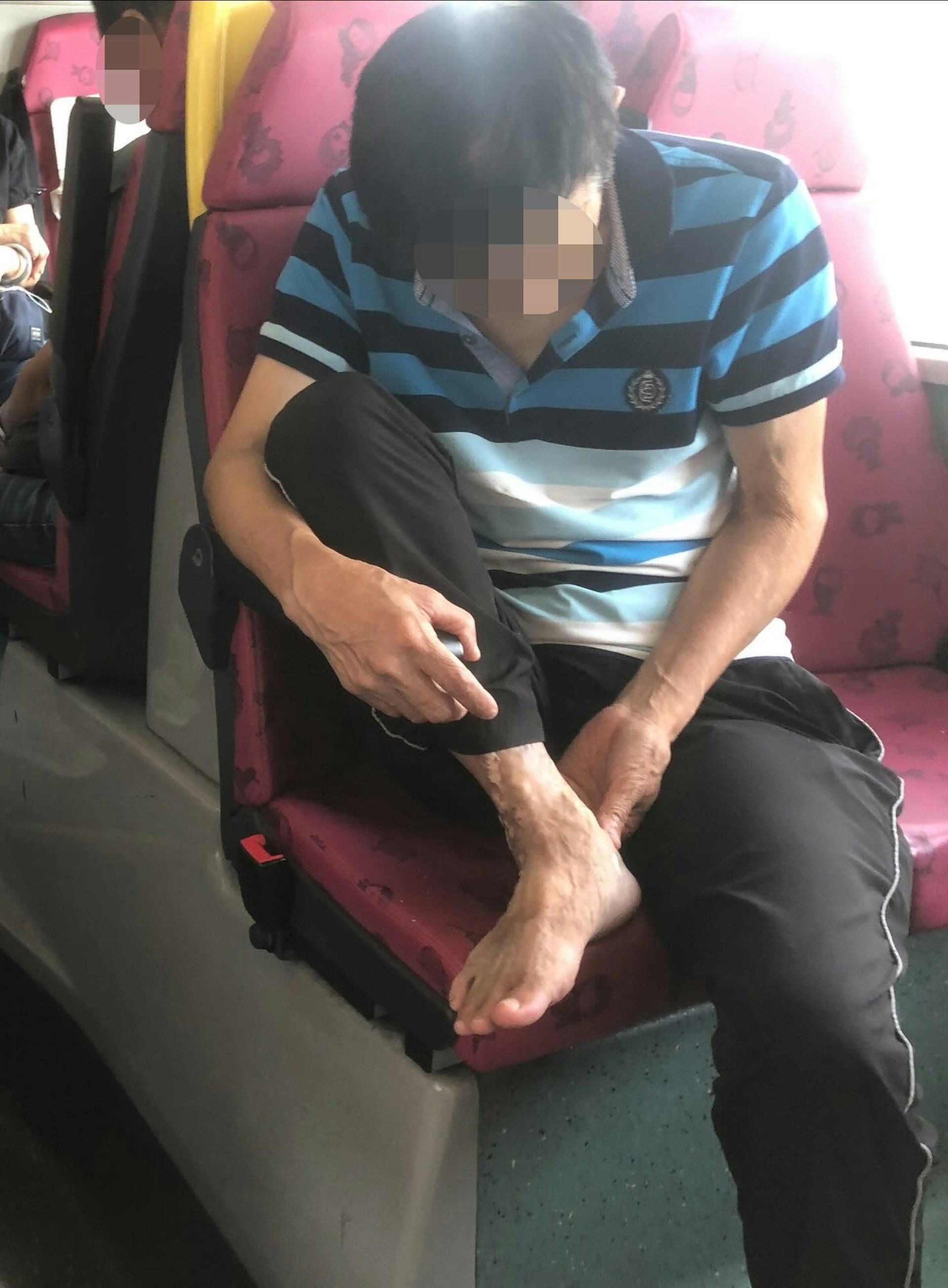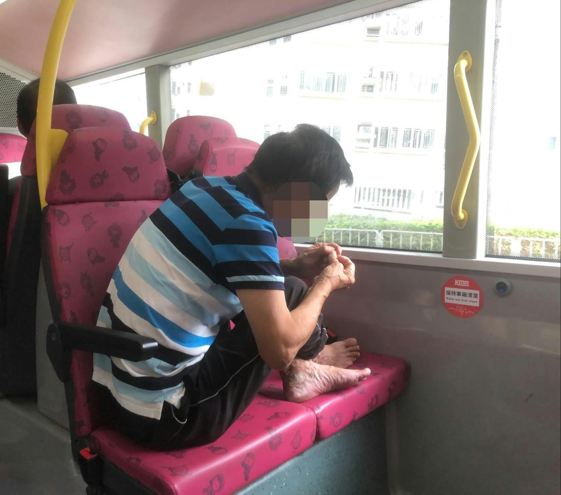 該圖片中可見,一名大叔坐在一輛九巴的下層座位期間,脫去鞋後把其右腳放在座椅上,其手則正在搣腳皮及搣手指。