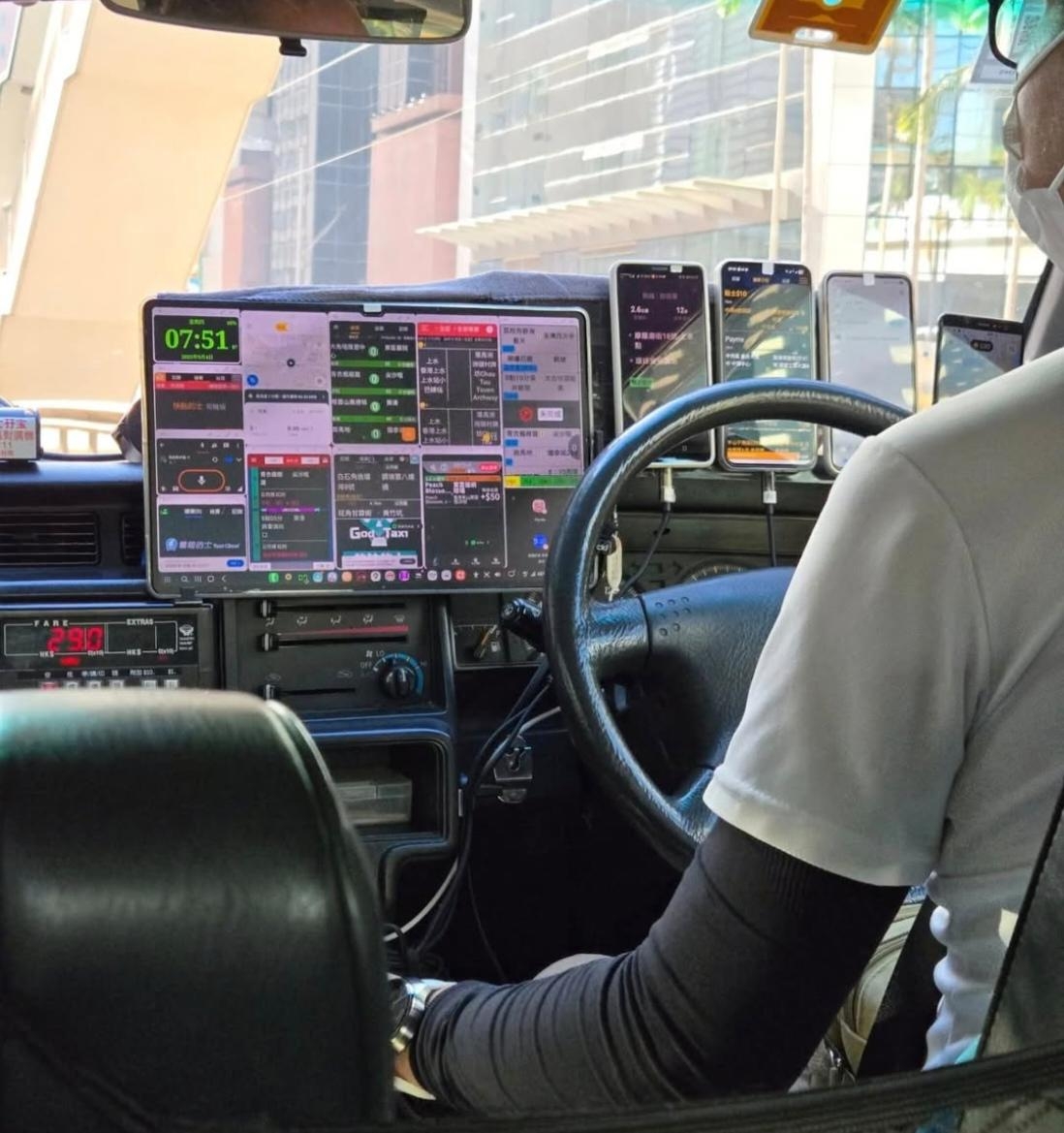 該圖片中可見香港的士內司機為接網上訂單,座前放滿大屏幕及多部手機,十分誇張,對司機的視線造成一定的影響。