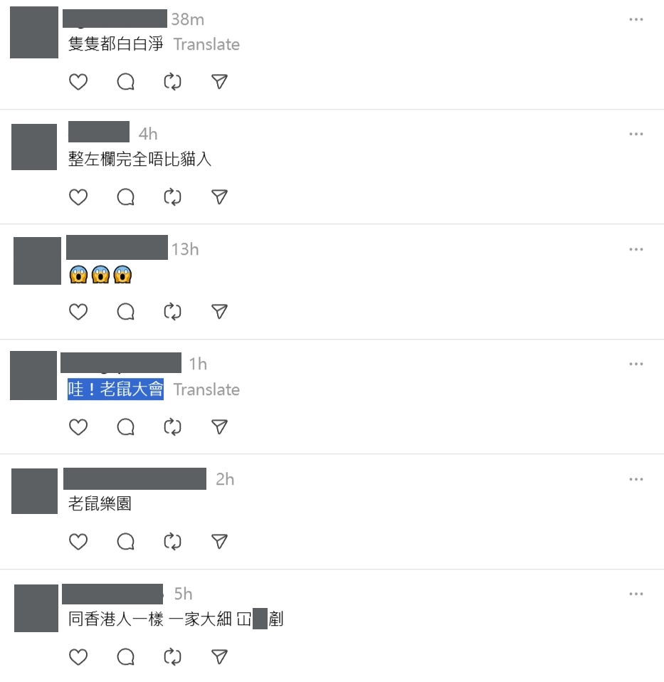 網民對此議論紛紛,不少人留言表示「隻隻都白白淨」、「整咗欄完全唔比貓入」、「哇!老鼠大會」、「老鼠樂園」、「同香港人一樣,一家大細冚X剷」等。![]()