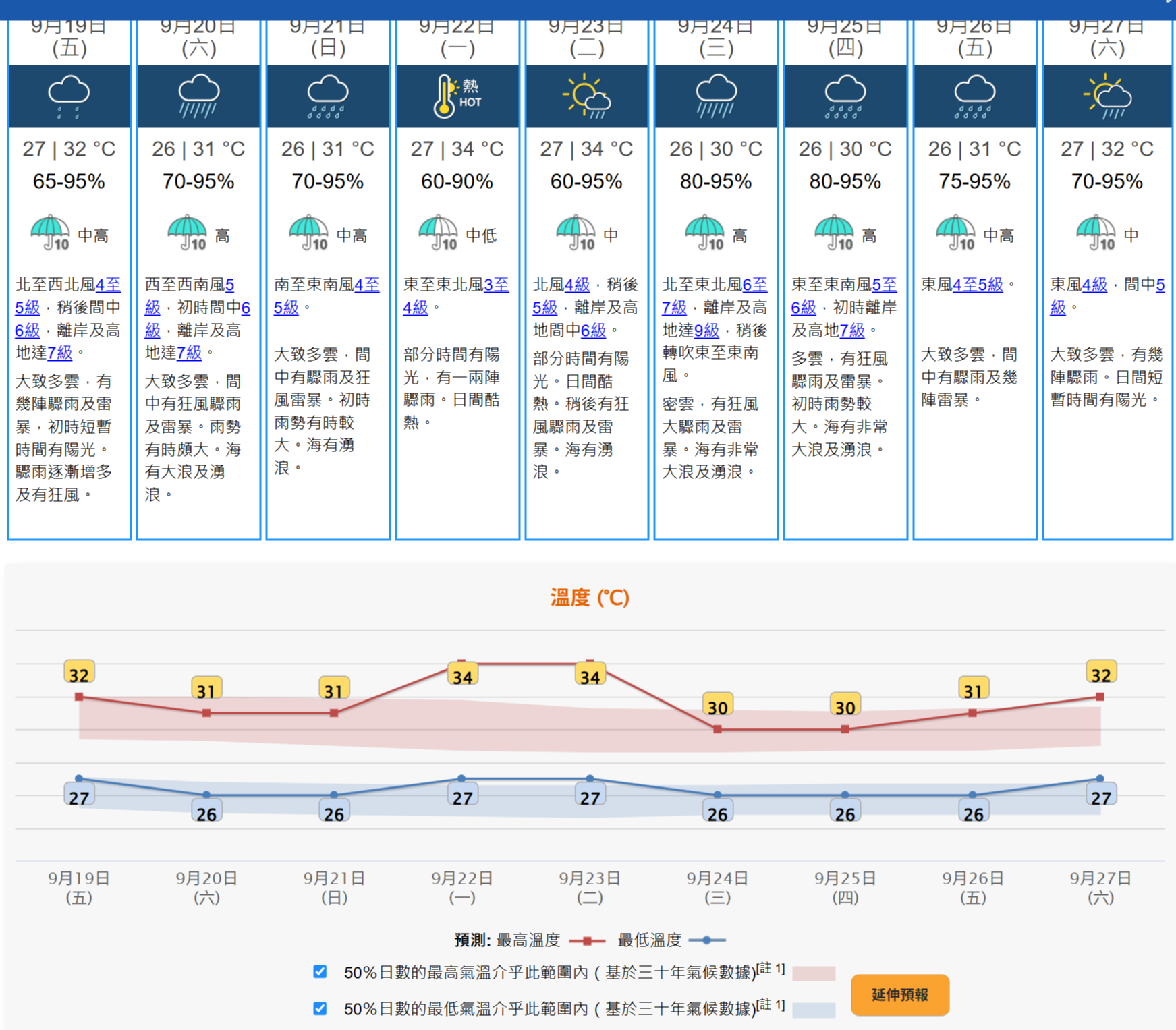 天文台預料,本港今日下午天氣仍然酷熱,明日風勢增強,驟雨逐漸增多,星期六 (9月20日) 間中有狂風驟雨及雷暴,雨勢有時頗大,海有湧浪。