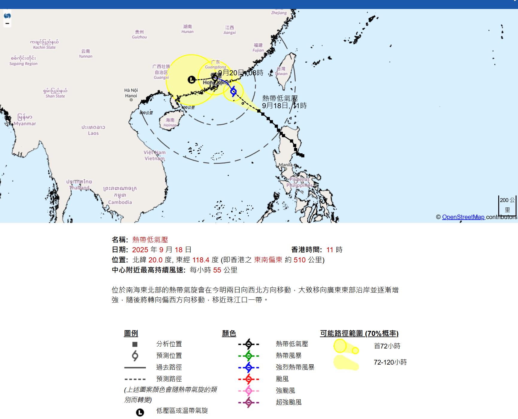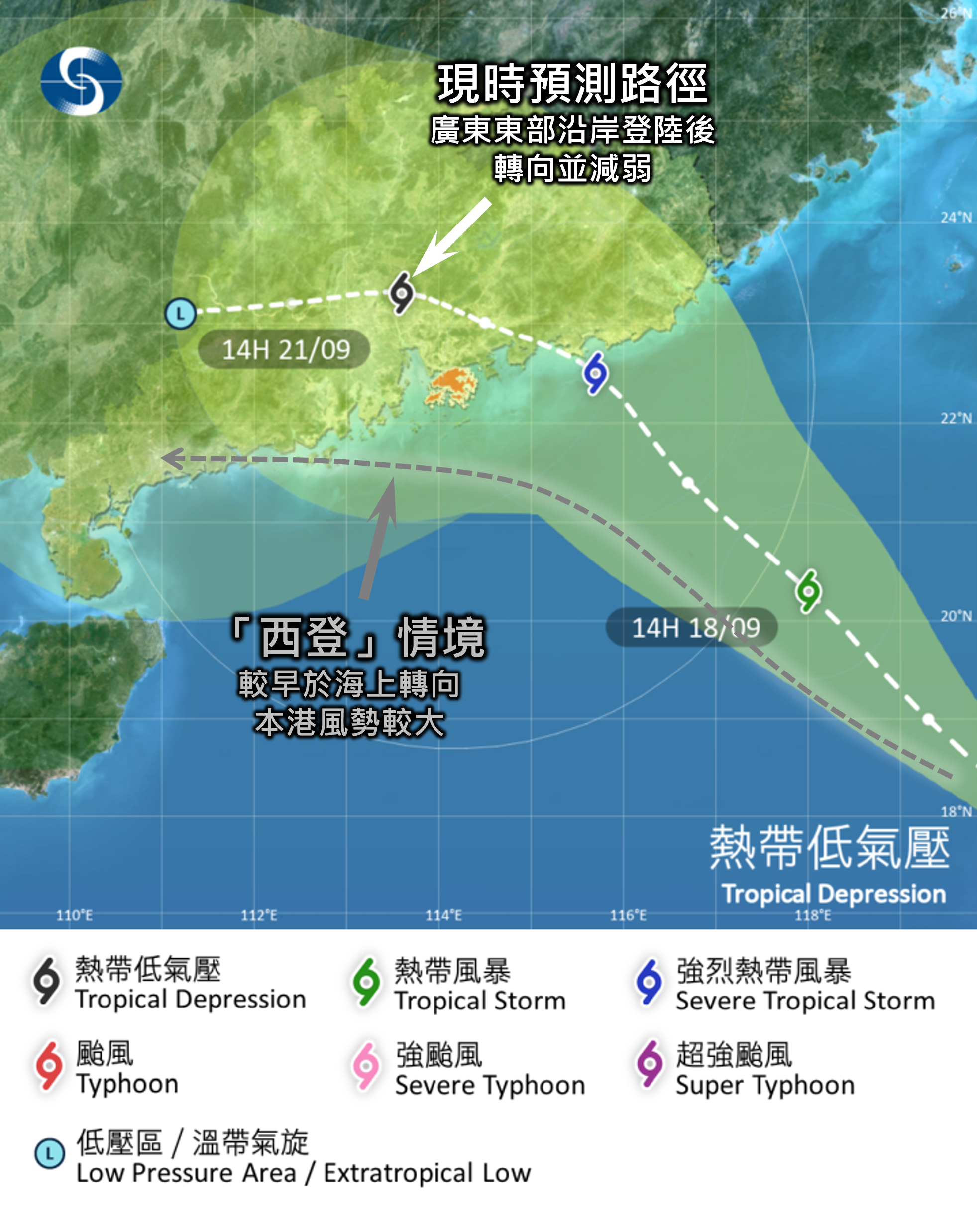按照現時預測,該熱帶氣旋會在今明兩日逐漸增強,靠近廣東東部沿岸,屆時將受東北季候風影響而轉向偏西方向移動,移近珠江口一帶,但其登陸位置及強度存在變數。天文台會視乎該熱帶氣旋的強度、其強風區與本港的距離及本地風力變化,評估是否需要在明日 (9月19日) 改發更高熱帶氣旋警告信號。![]()