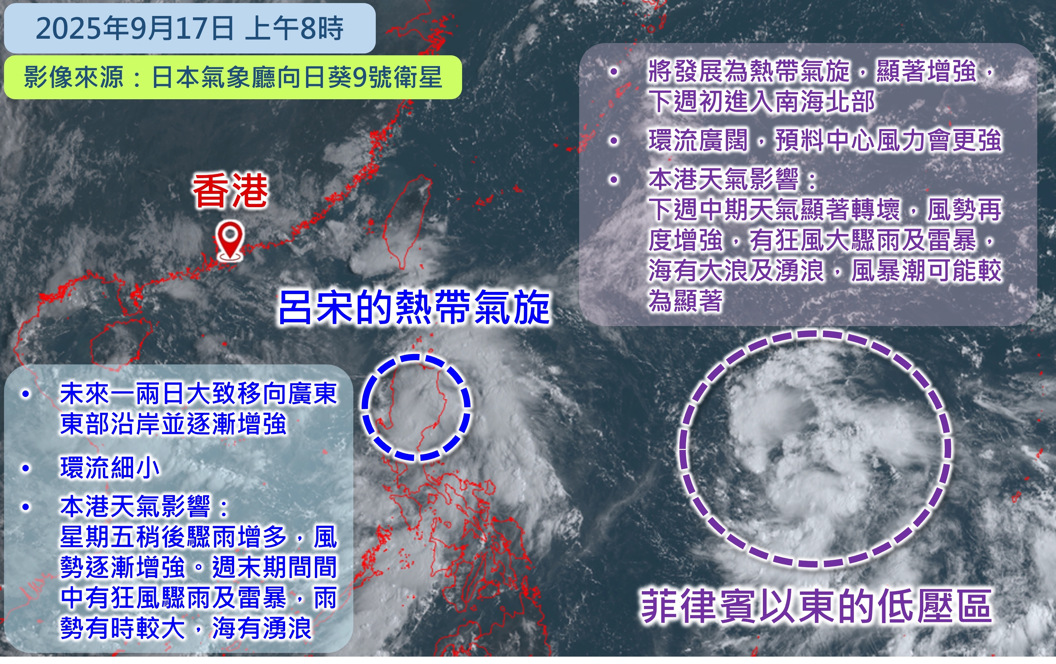 事實上,天文台在昨天 (9月17日) 發表的「天氣隨筆」指出,位於呂宋的熱帶氣旋會在未來一兩日(9月18及19日)採取西北路徑橫過南海東北部,逐漸增強,大致移向廣東東部沿岸,但受東北季候風影響,該熱帶氣旋隨後將轉向偏西方向移動,靠近珠江口一帶。