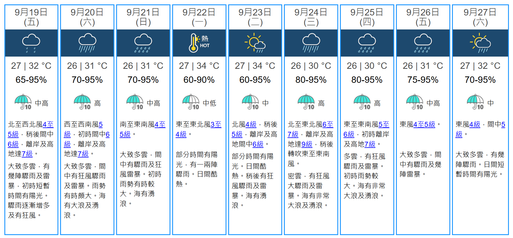 事實上,根據天文台最新九天天氣預報顯示,下周二(9月23日)風力離岸及高地間中6級;下周三(9月24日)離岸及高地由8級上調至9級;下周四(25日)初時離岸及高地7級。