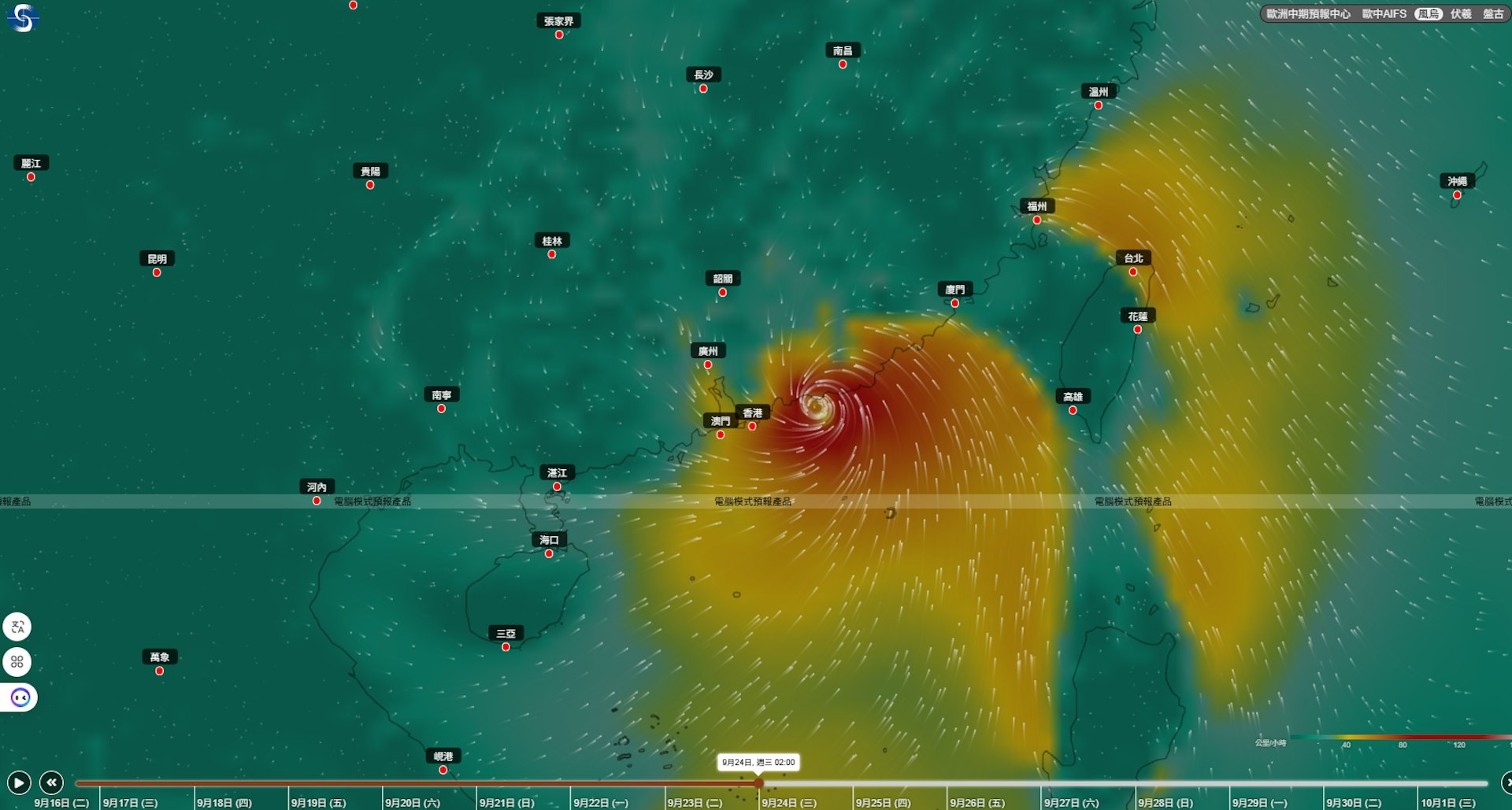 另外,根據AI人工智能預報系統「風烏」預計下周三(9月24日)凌晨2時風暴料在香港以東、汕尾市南部海域登陸,其時巨大環流及強勁風圈會影響香港。
