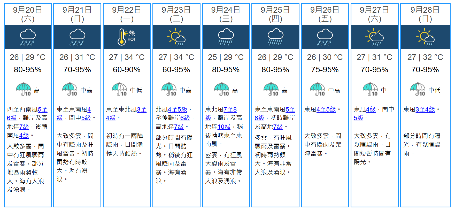 事實上,天文台今天上調了下周三的風力預測,離岸及高地由原來的9級上調至10級,也就是達到「暴風」程度。