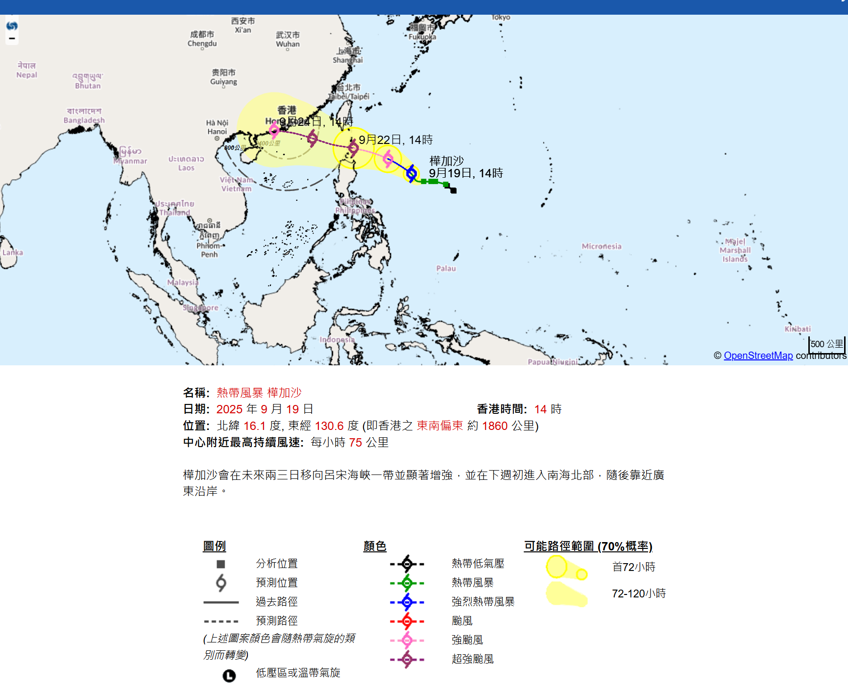 根據天文台最新路徑圖顯示,今天下午2時「樺加沙」距離香港1860 公里,中心附近最高持續風速為每小時75公里,預計下周三(9月24日)最接近香港,早上約8時位於香港以南海域趨向珠江口一帶位置,屆時樺加沙會略為減弱至強颱風級別,中心附近最高持續風速達每小時175公里。