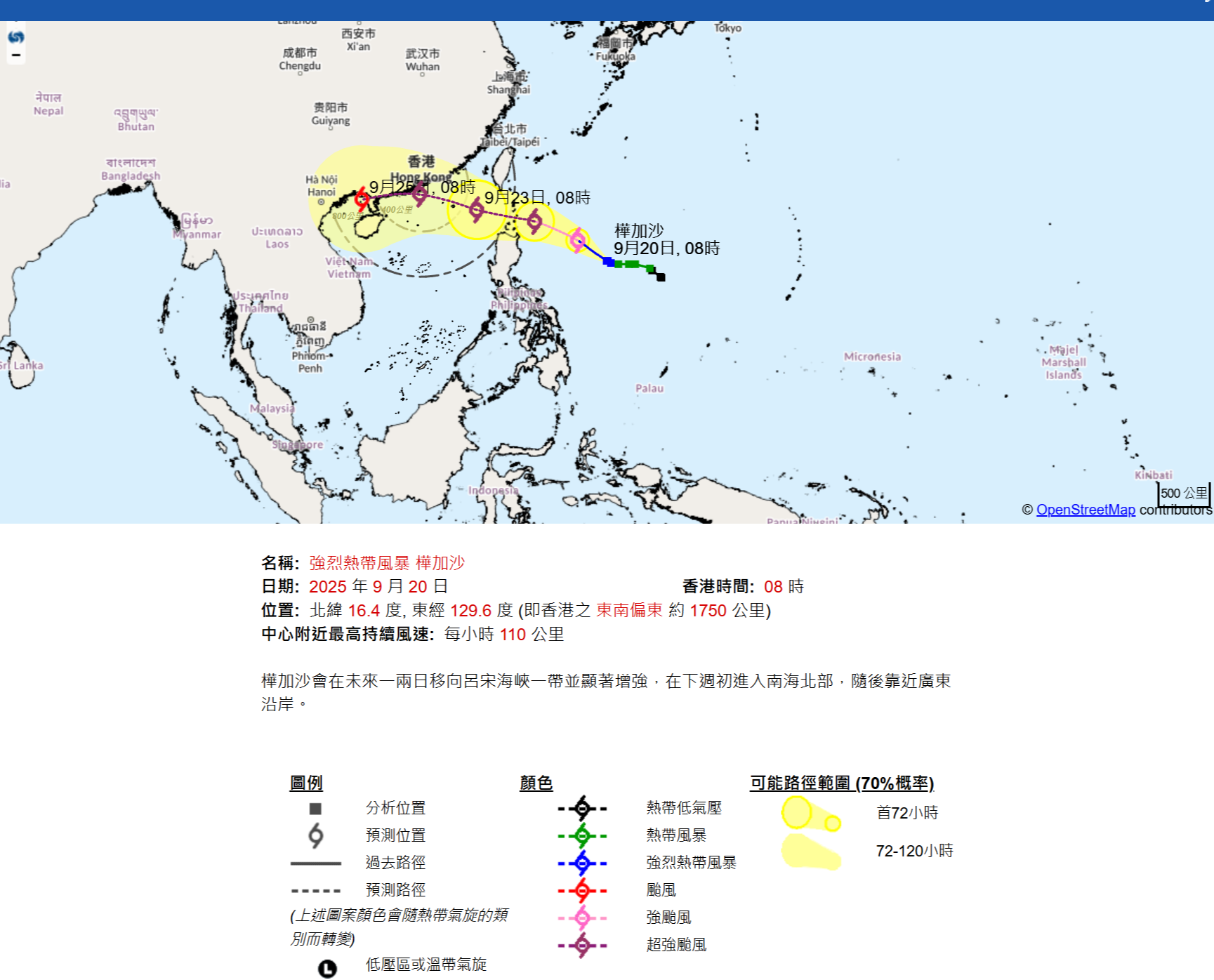 黃色暴雨警告信號現正生效,香港天文台在今天 (9月20日) 下午12時30分出的特別天氣提示指出,預計熱帶氣旋「樺加沙」會在未來一兩日移向呂宋海峽一帶並顯著增強,有機會以超強颱風強度在下週中期靠近廣東沿岸。