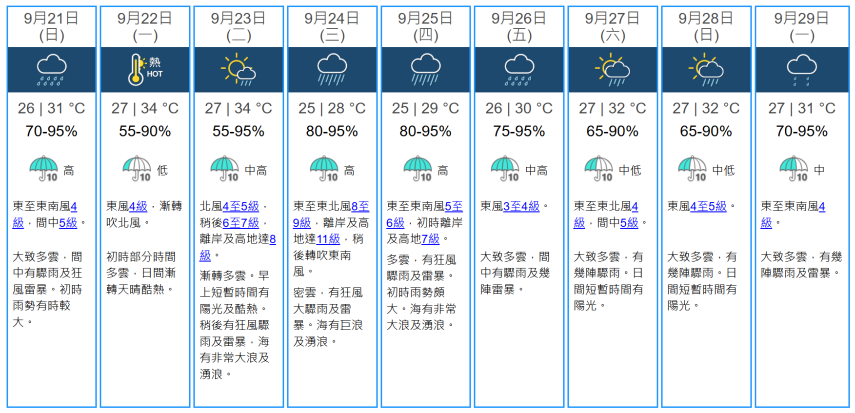 按照現時預測,本港下星期二 (9月23日) 天氣逐漸轉壞,下星期三 (9月24日) 吹烈風至暴風,天氣惡劣,有狂風大驟雨及雷暴,海有巨浪及湧浪。