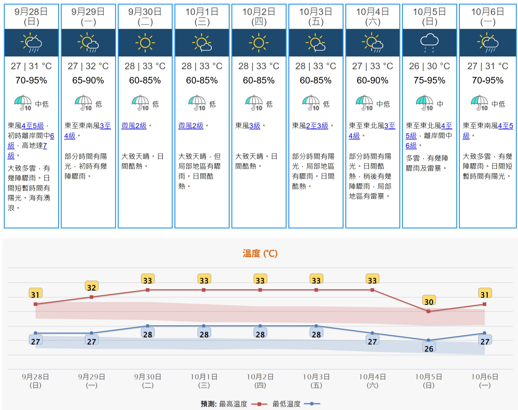 天文台預計,本港今午部分時間有陽光及酷熱,今晚大致多雲,吹和緩至清勁東至東北風,離岸及高地間中吹強風,海有湧浪,展望明日風勢仍然頗大,海有湧浪,亦有幾陣驟雨,隨後數日大致天晴及酷熱。