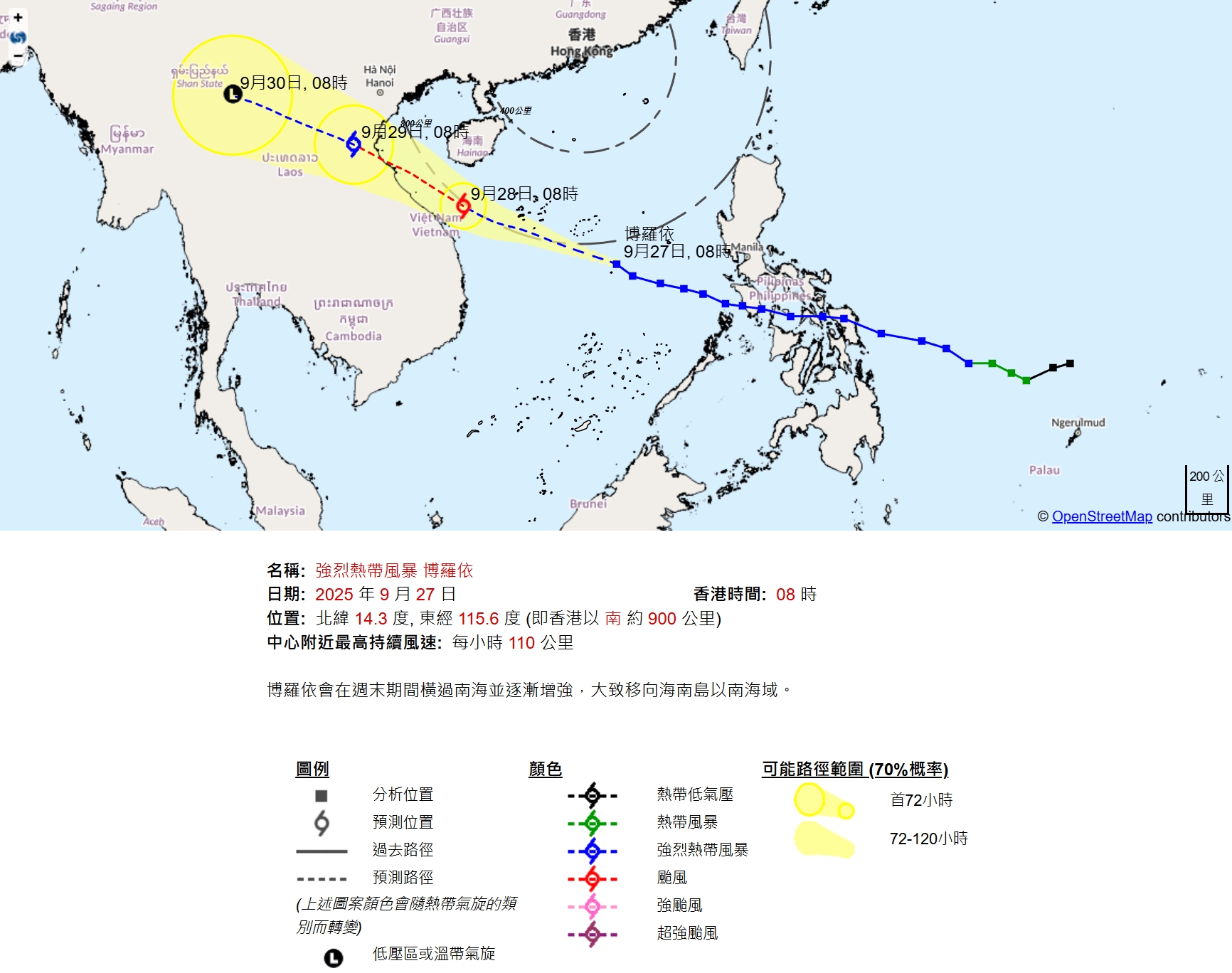 香港天文台在今天 (9月27日) 發出的特別天氣提示表示,預料熱帶氣旋「博羅依」會在週末期間橫過南海並逐漸增強,大致移向海南島以南海域,與香港保持相當距離,對本港直接威脅不大,但受中國東南沿岸的高壓脊及博羅依的共同影響,華南沿岸風勢頗大,海有大浪及湧浪。