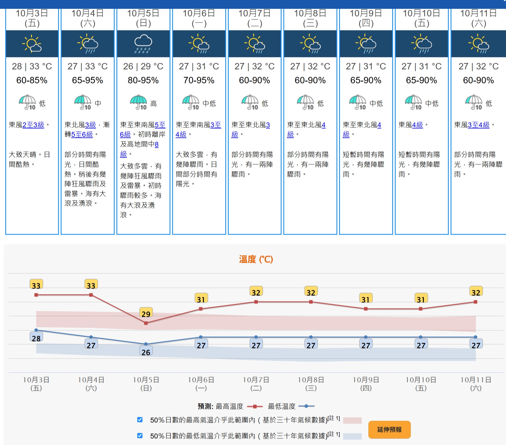 天文台展望明日大致天晴及酷熱,星期六 (10月4日) 稍後至星期日 (10月5日) 風勢頗大,海有大浪及湧浪,驟雨較多,中秋節及翌日部分時間有陽光,有幾陣驟雨。