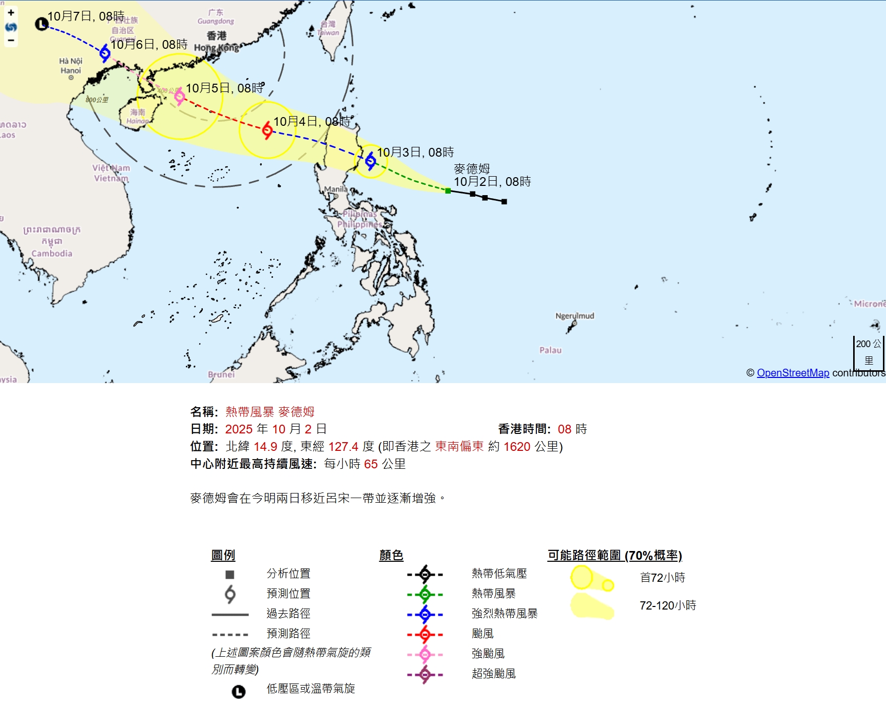 香港天文台在今天 (10月2日) 正午12時表示,位於菲律賓以東海域的「麥德姆」會在明日(10月3日)橫過呂宋,並在稍後進入本港800公里範圍內,天文台會考慮在明晚發出一號戒備信號。