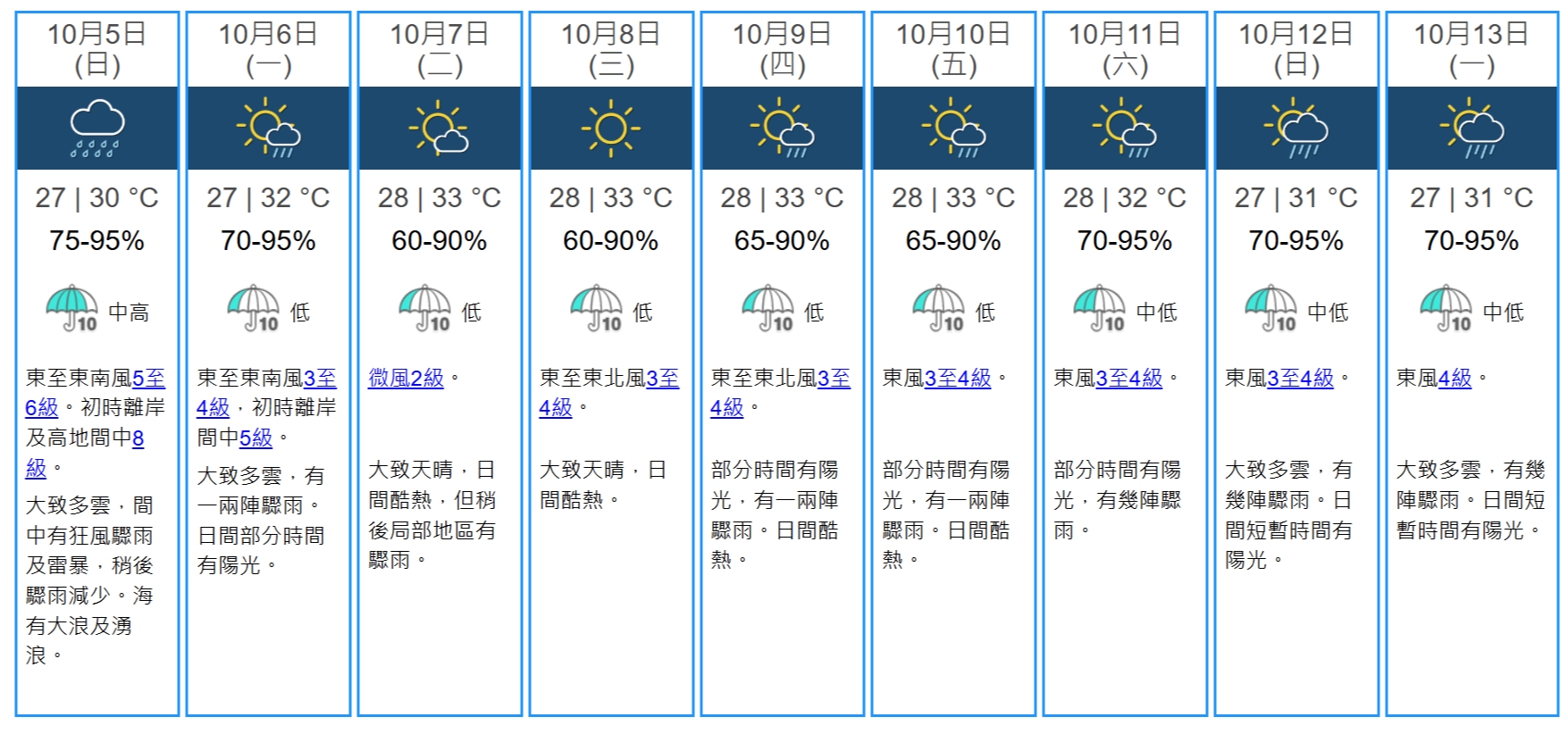 事實上,根據天文台最新九天天氣預報顯示,本港明天 (10月5日) 初時離岸及高地的風力間中達8級,也就是達到掛8號風球的其中一項指標。