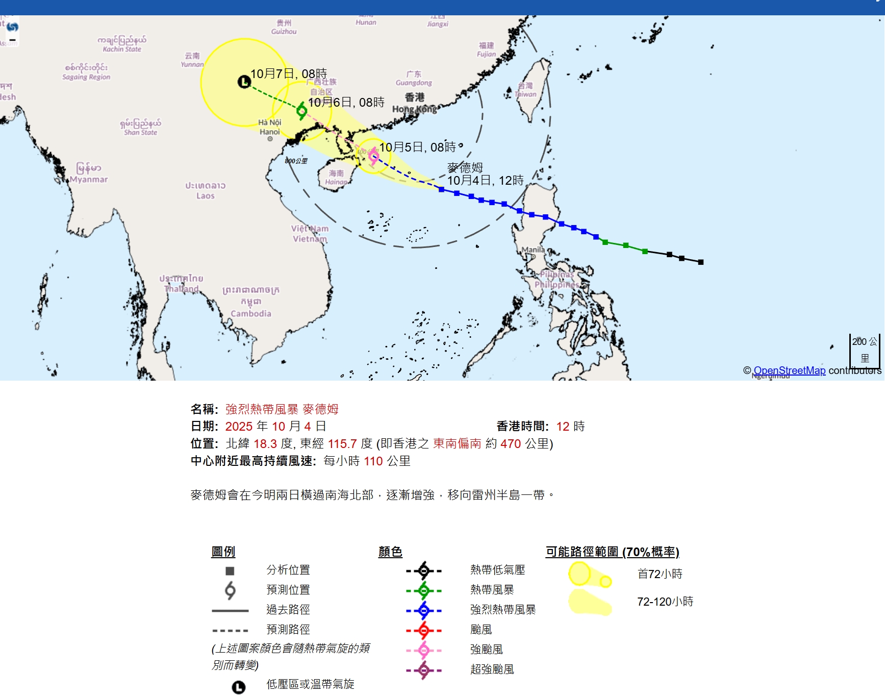 天文台預料,麥德姆會逐步增強並移向雷州半島一帶,天文台會視乎麥德姆的強度、其烈風區與珠江口的距離及本地風力變化,評估是否需要在今晚改發更高熱帶氣旋警告信號。