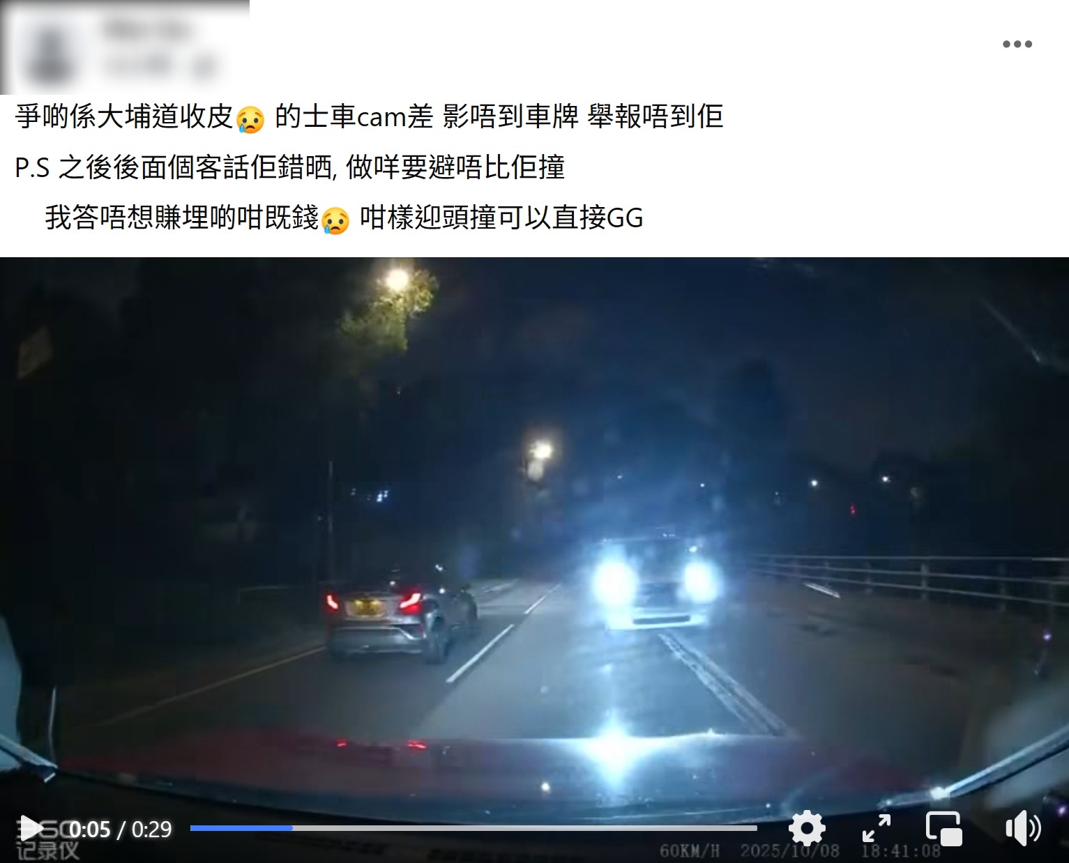 大埔公路現驚險一幕,一名的士司機日前在社交平台分享車Cam片段,指其駛經大埔公路沙田段時,險遭一輛迎頭駛來的客貨車猛撞。雖然最終成功避開,但事後司機坦言「爭啲喺大埔道收皮」,並無奈表示車Cam畫質過低,未能清晰拍攝涉事車牌,無法舉報。