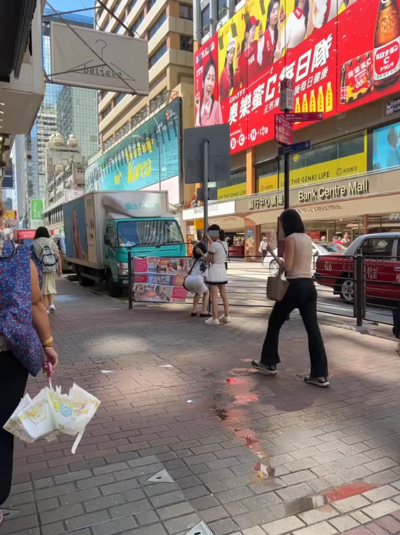 該視頻中可見1名身穿白色短褲及涼鞋的女子,白天站在旺角西洋菜南街銀行中心廣場對開行人路,期間突然用雙手扶住1支路牌的鐵柱,「蛇形式」下半身先半蹲繼而起身貼近鐵柱,然後再次蹲下,動作流暢,下半身一直沒有碰到該鐵柱,旁邊身穿白色短裙相信是其朋友的女子,期間並没有理會,看似見怪不怪。