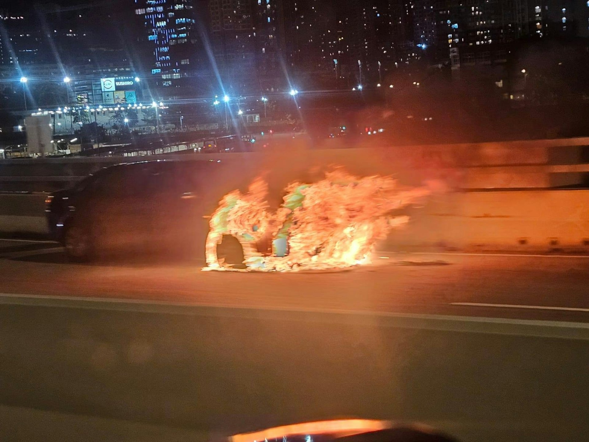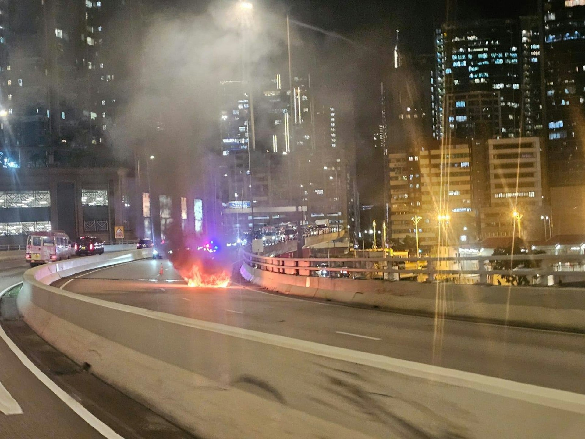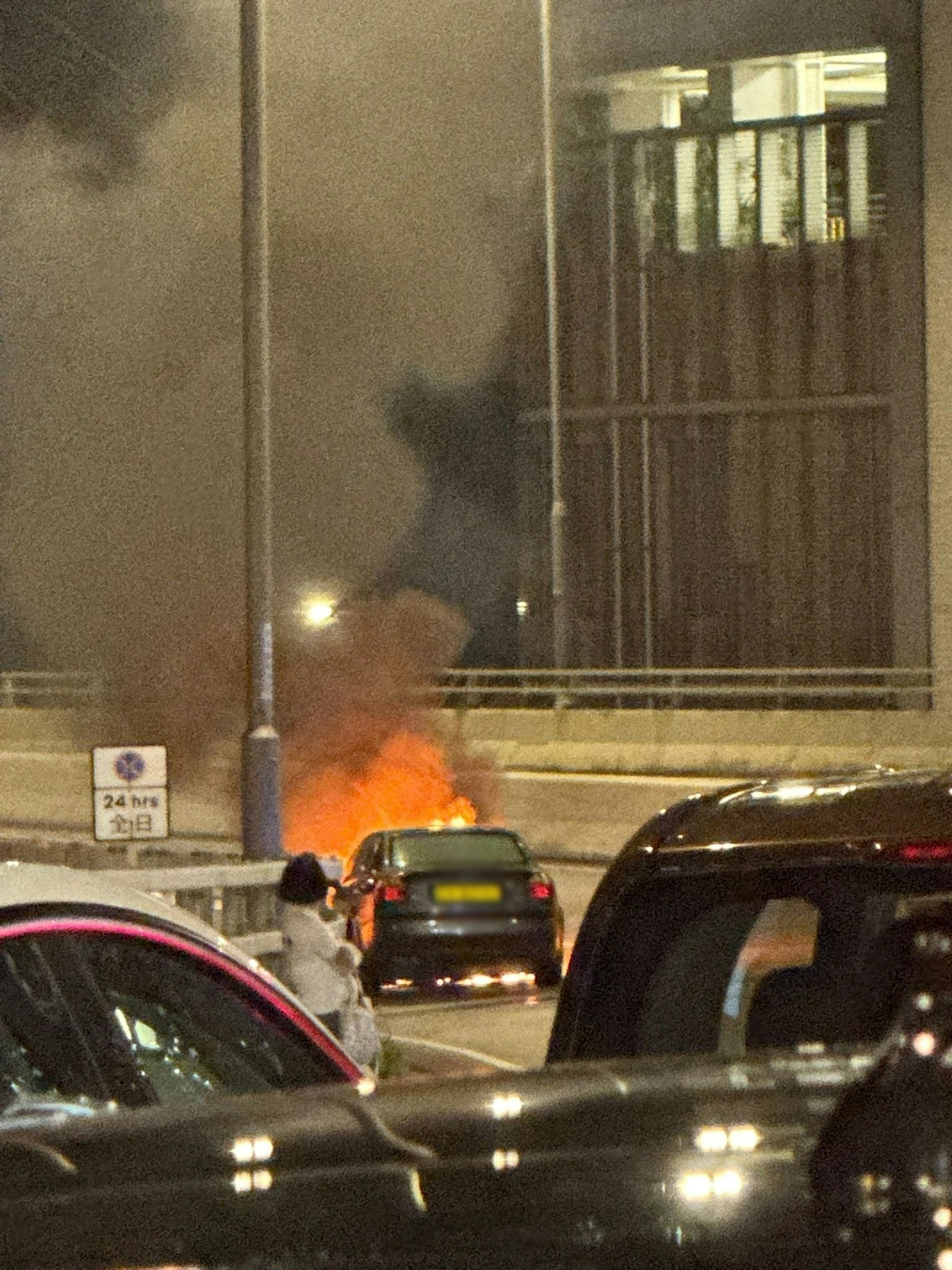 西九龍走廊一輛私家車昨晚 (10月14日) 突然自焚陷入火海,女司機急忙逃生。