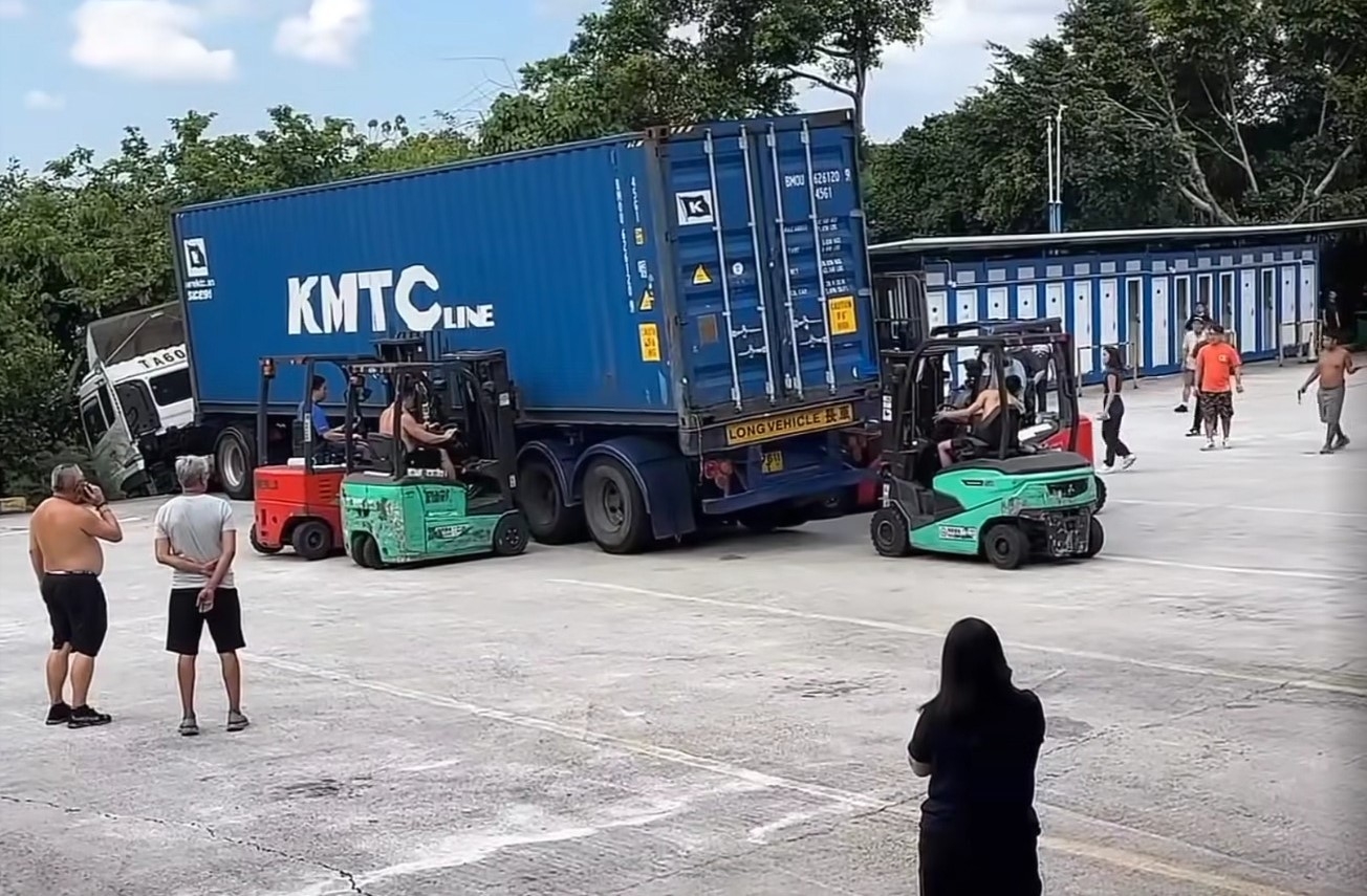 網上流傳一段現場影片,顯示多名工友得悉意外後迅速趕至,當中五人分別駕駛剷車,從左右及後方合力升高貨櫃車,嘗試救出被困司機。影片中可見,左邊兩部剷車穩住車身防止翻側,右邊一部剷車則插入車尾位置,成功將避震系統升高約20厘米,令車身騰空,為救援爭取空間。