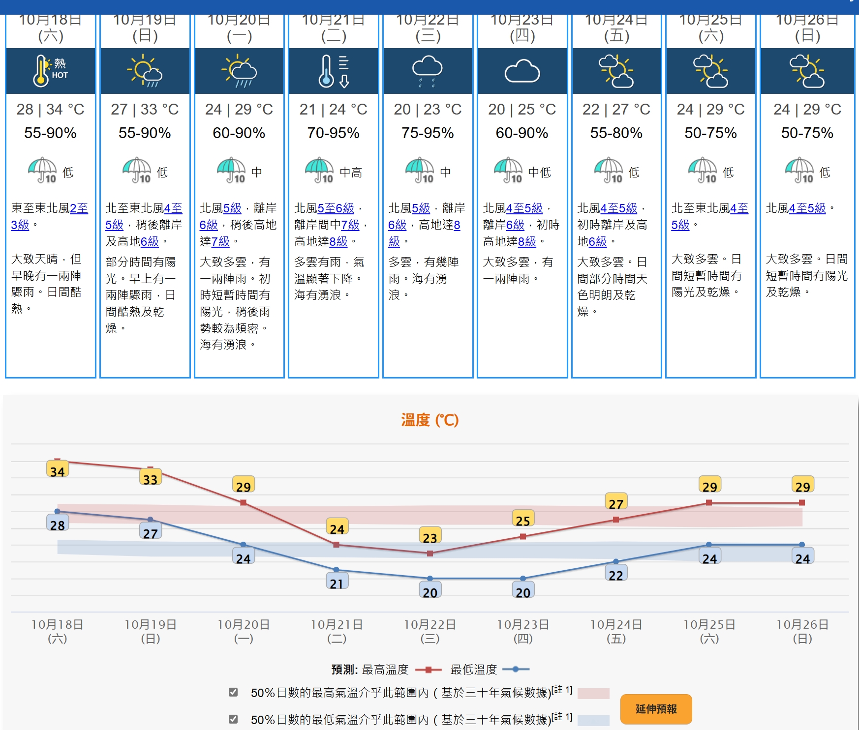 天文台預計,本港今午大致天晴,吹和緩東至東北風,展望明日大致天晴,日間酷熱,星期日 (10月19日) 北風逐漸增強,隨後數日風勢持續頗大,漸轉多雲有雨,市區氣溫顯著下降至20度左右,新界再低兩三度,晚間部分沿岸低窪地區可能出現水浸。