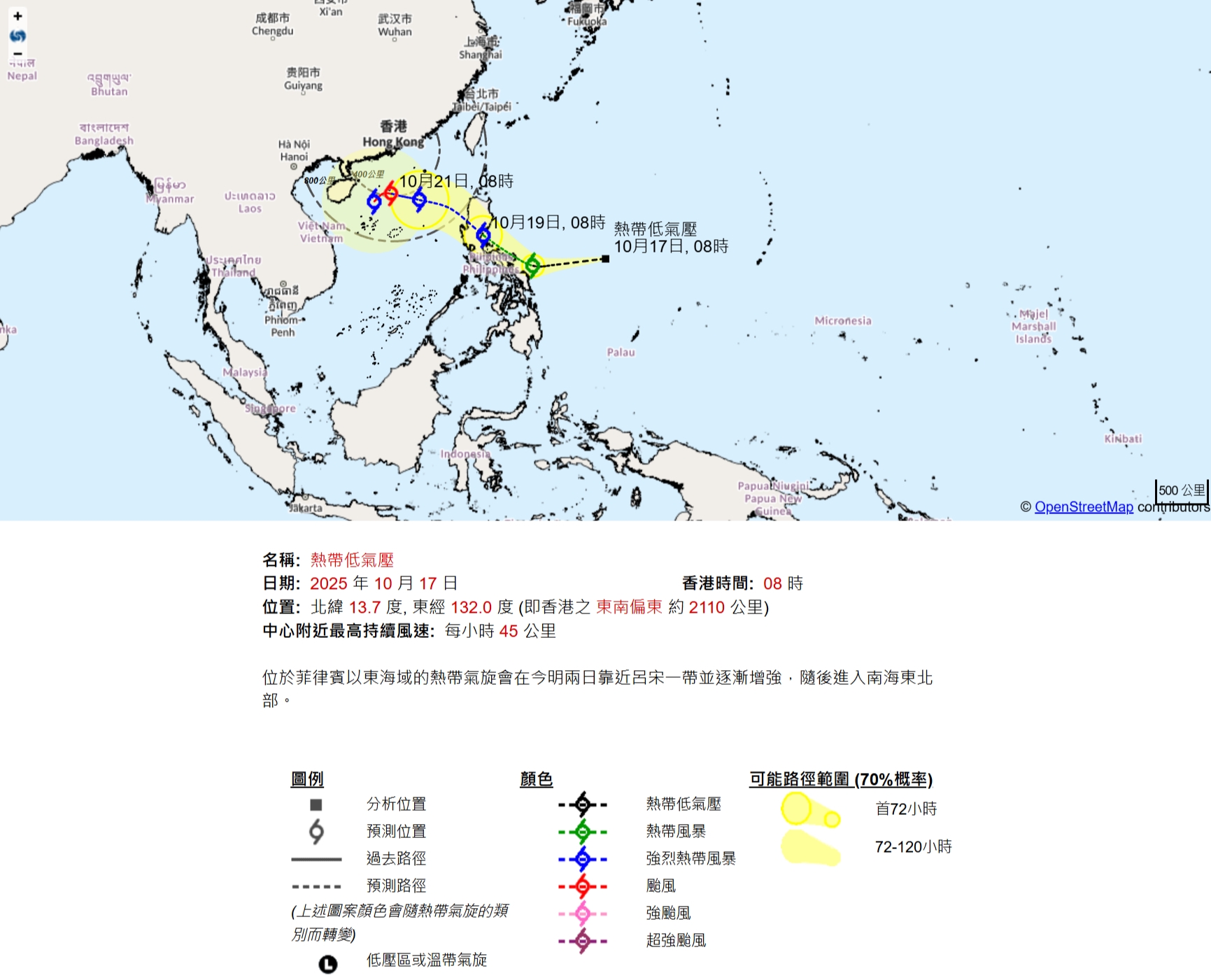 天文台表示,位於菲律賓以東海域的低壓區已增強為熱帶低氣壓。在今天正午12時,位於菲律賓以東海域的熱帶低氣壓集結在馬尼拉以東約1090公里,預料向西移動,時速約30公里,靠近呂宋一帶並逐漸增強。