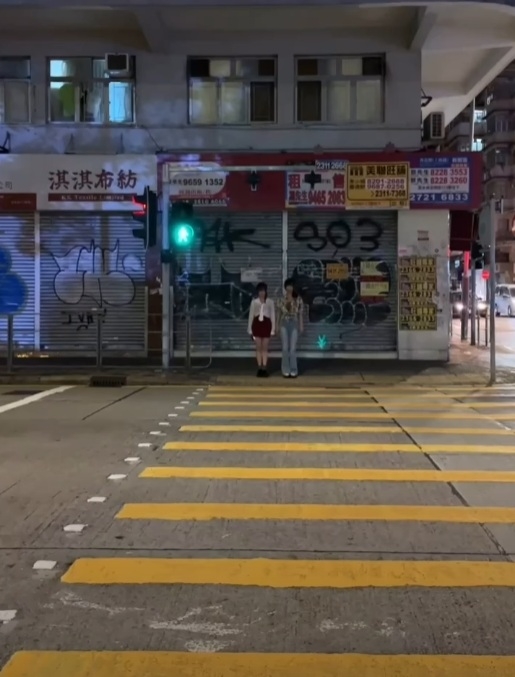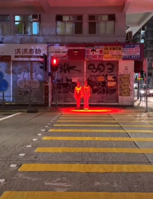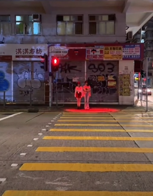 圖片中可見有網民近曰最新拍攝深夜香港街口用於提醒過馬路「低頭族」的紅色強光,打在對面馬路的2名年輕女子身上,其紅色身驅令人毛骨悚然,再次挑戰你膽量!![]()