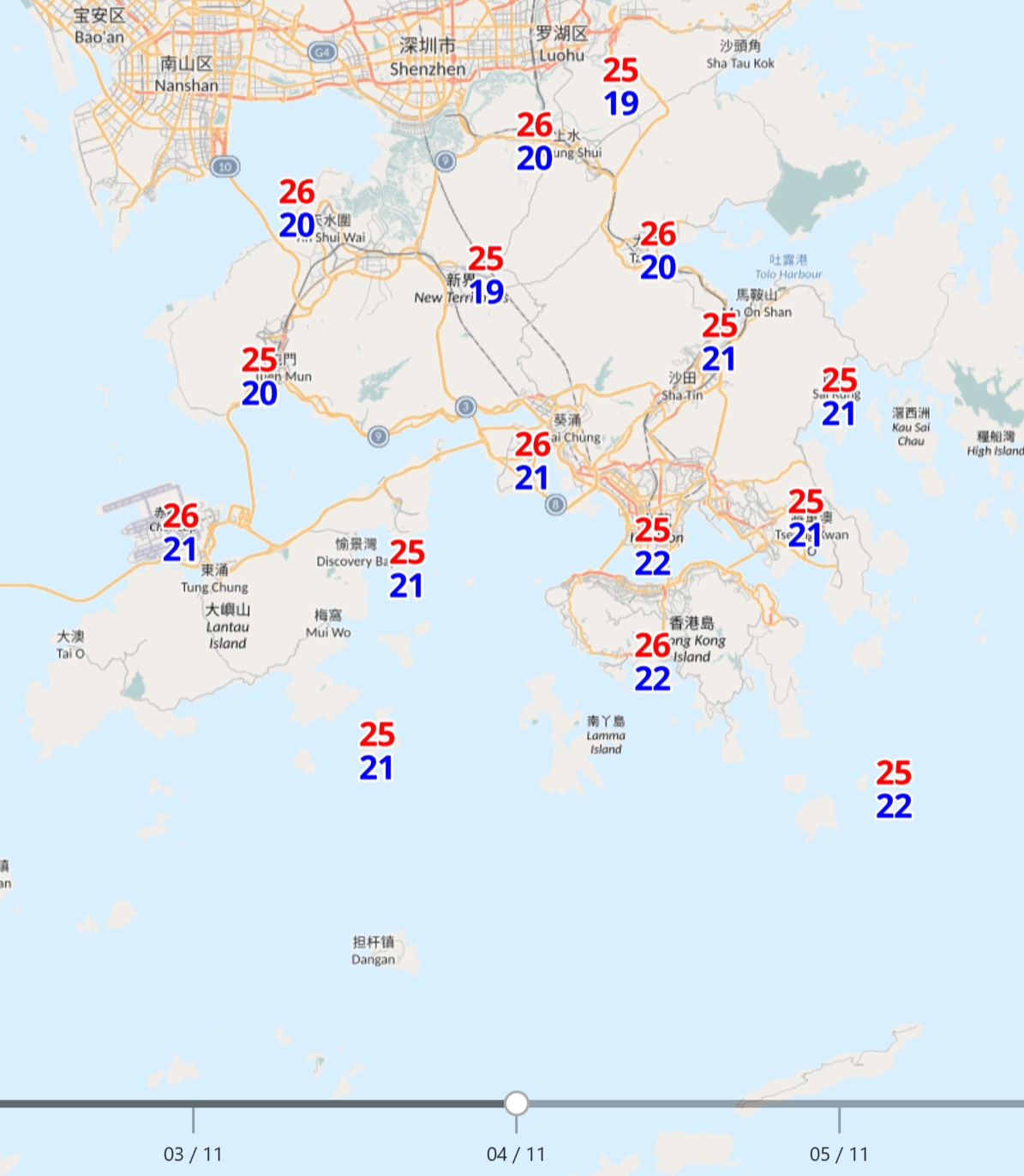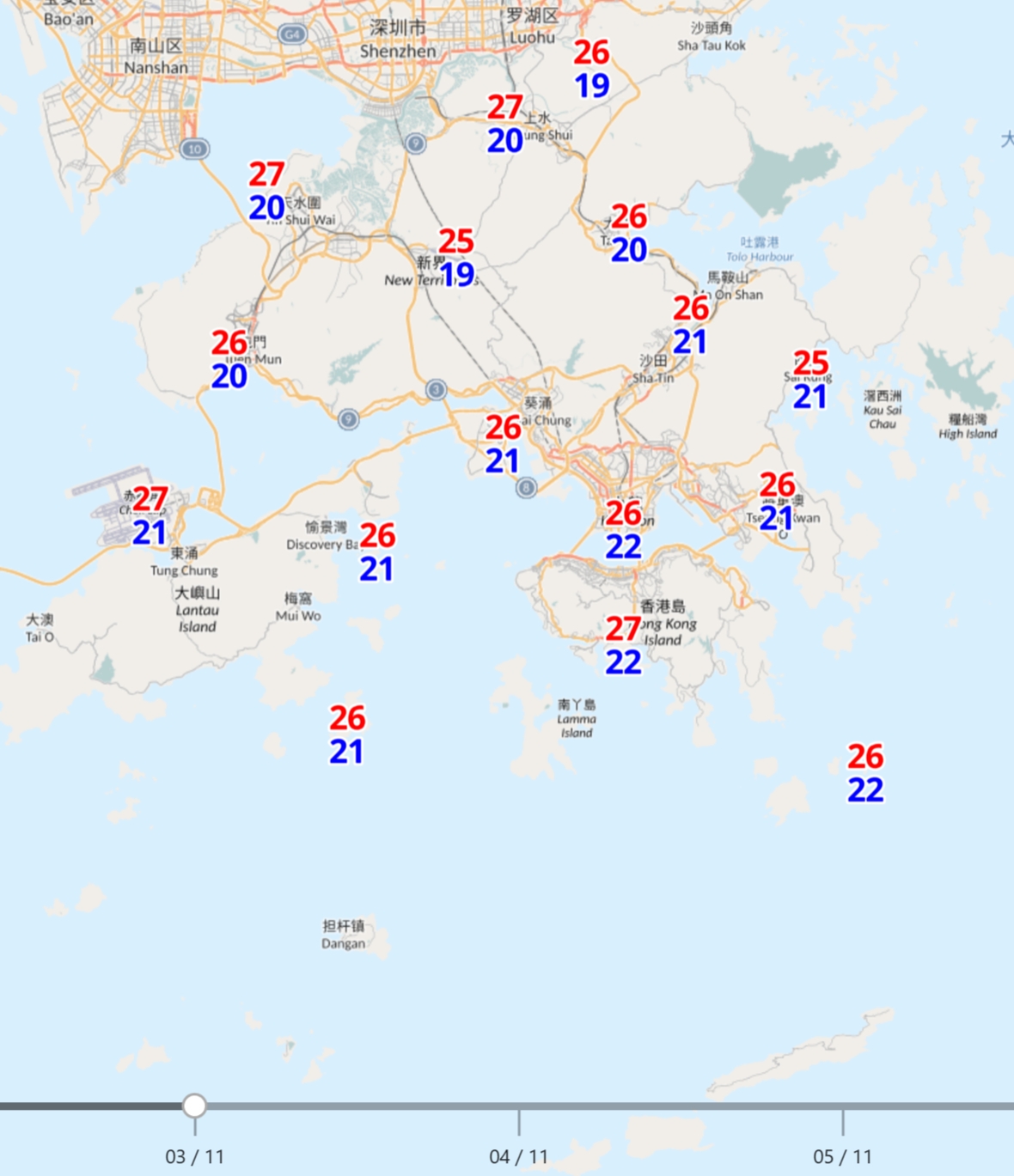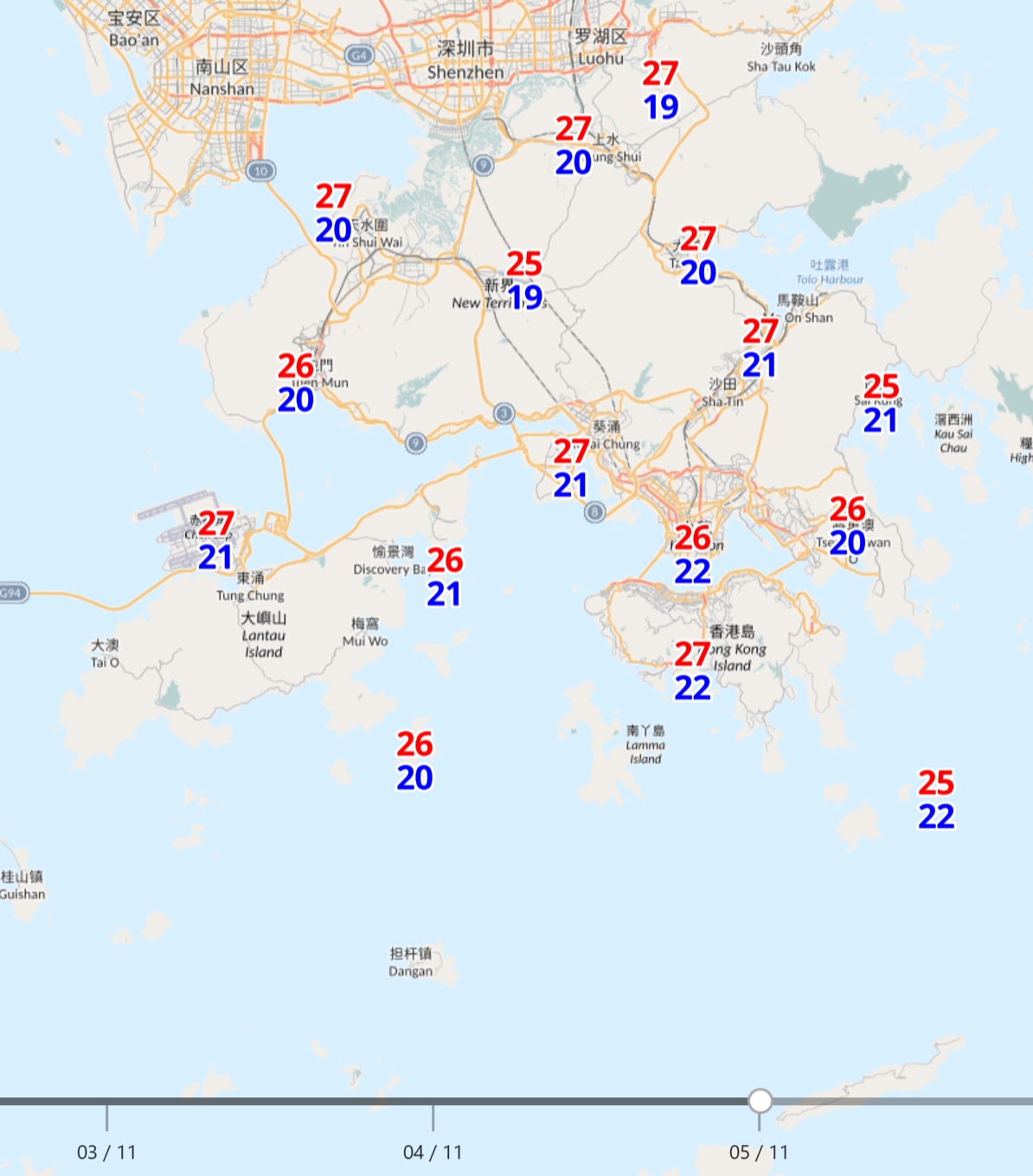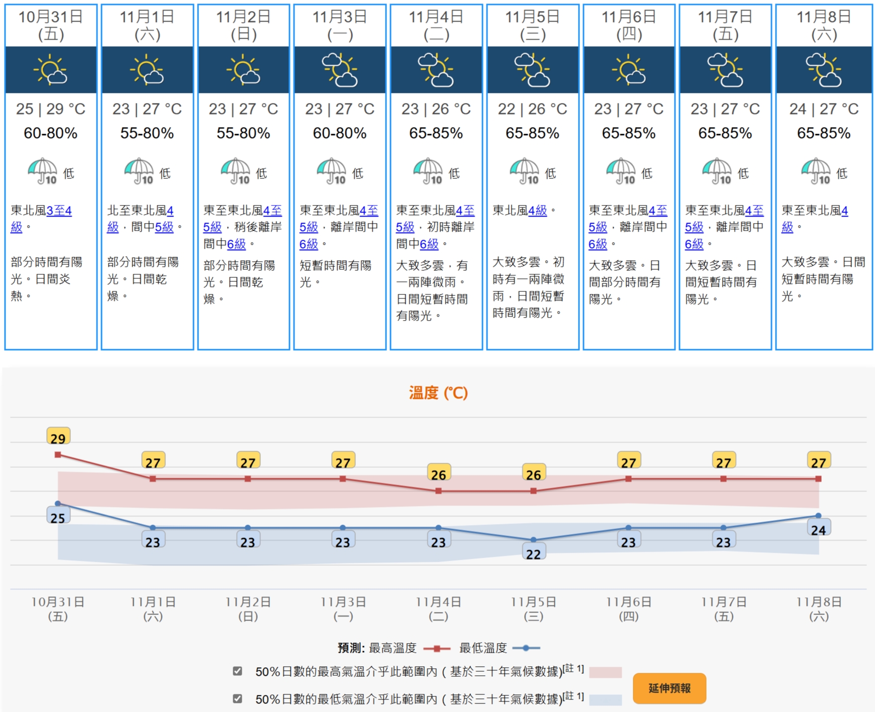 此外,根據天文台最新的分區氣温預測顯示,下周一至下周三 (11月3日至11月5日) 其中打鼓嶺及石崗均低見19度,其餘各區氣温也普遍下降。