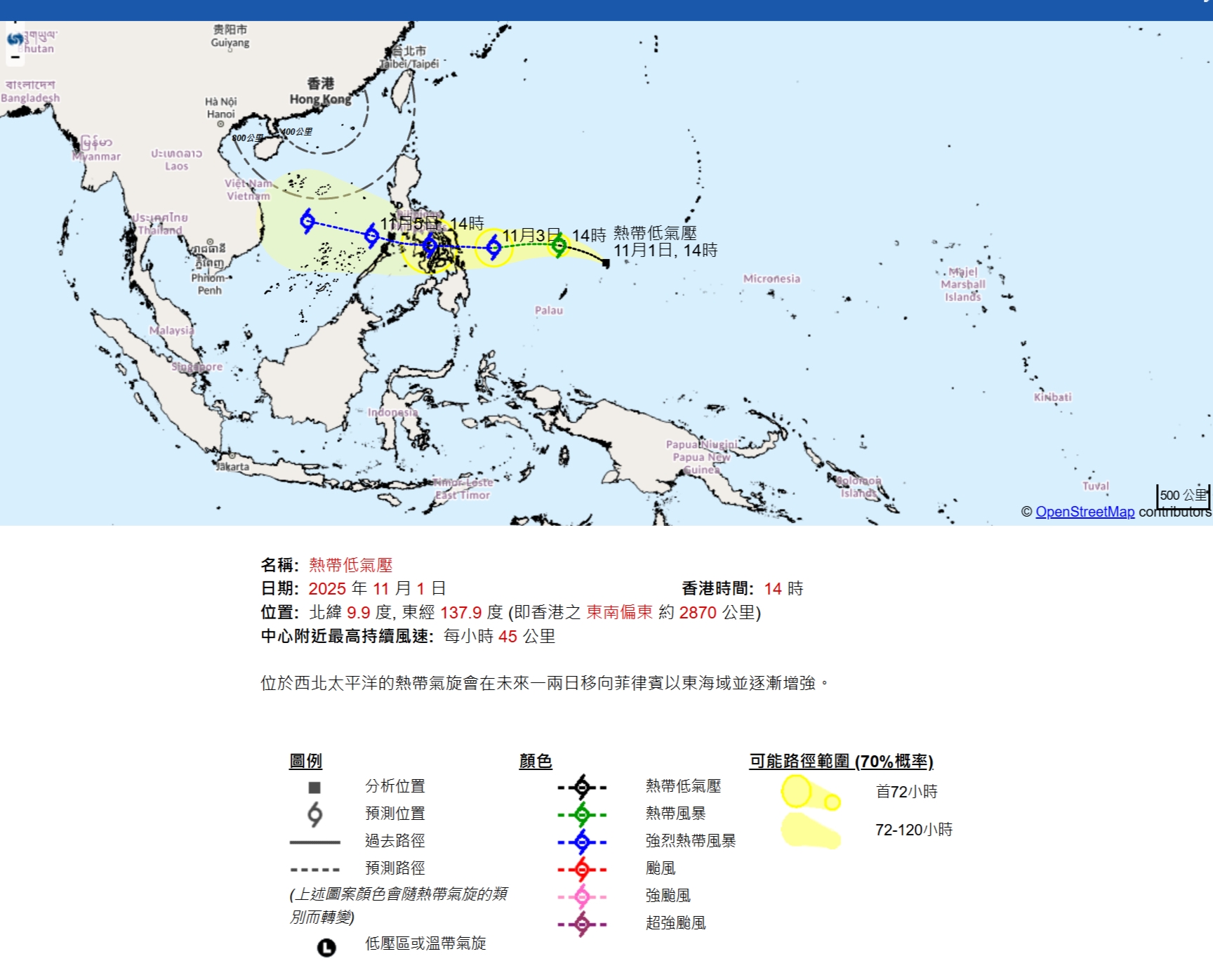 天文台指出,位於西北太平洋的低壓區已增強為熱帶低氣壓。在今天下午4時,該熱帶低氣壓集結在雅蒲島之西北約80公里,預料向西北偏西移動,時速約18公里,移向菲律賓以東海域。而位於南海中南部的另一個低壓區正為該區帶來不穩定天氣。