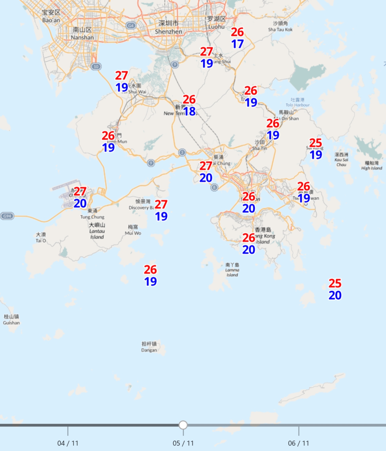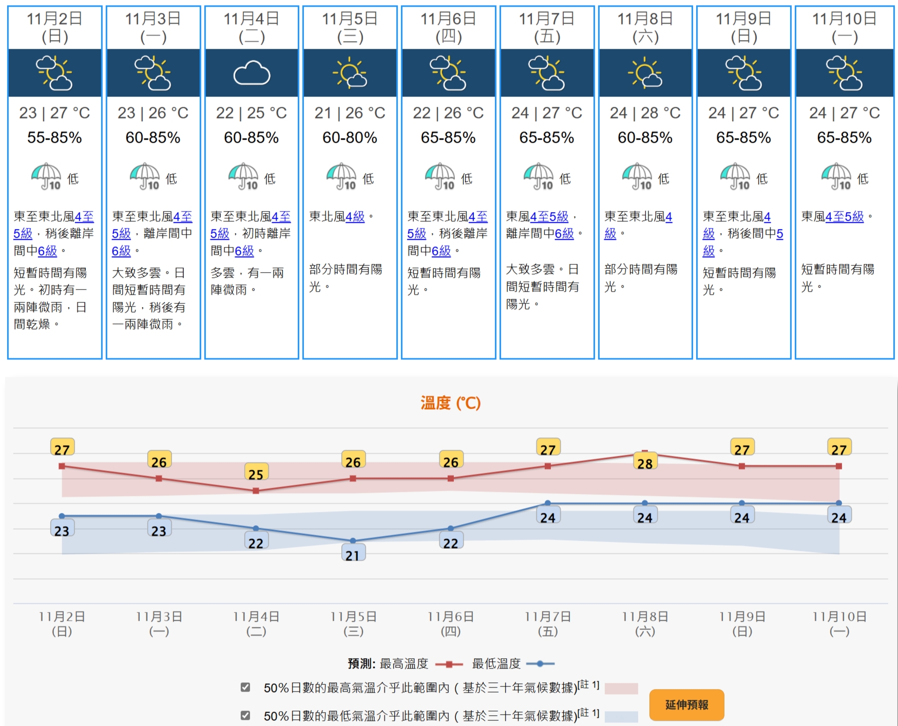 天文台指出,下周三 (11月5日) 早上稍涼。事實上,根據香港天文台最新分區氣温預測顯示,下周三香港多區氣温跌破20度水平,其中打鼓嶺低見17度,石崗低見18度,至於上水、大埔、沙田、屯門、將軍澳等地區則低見19度。