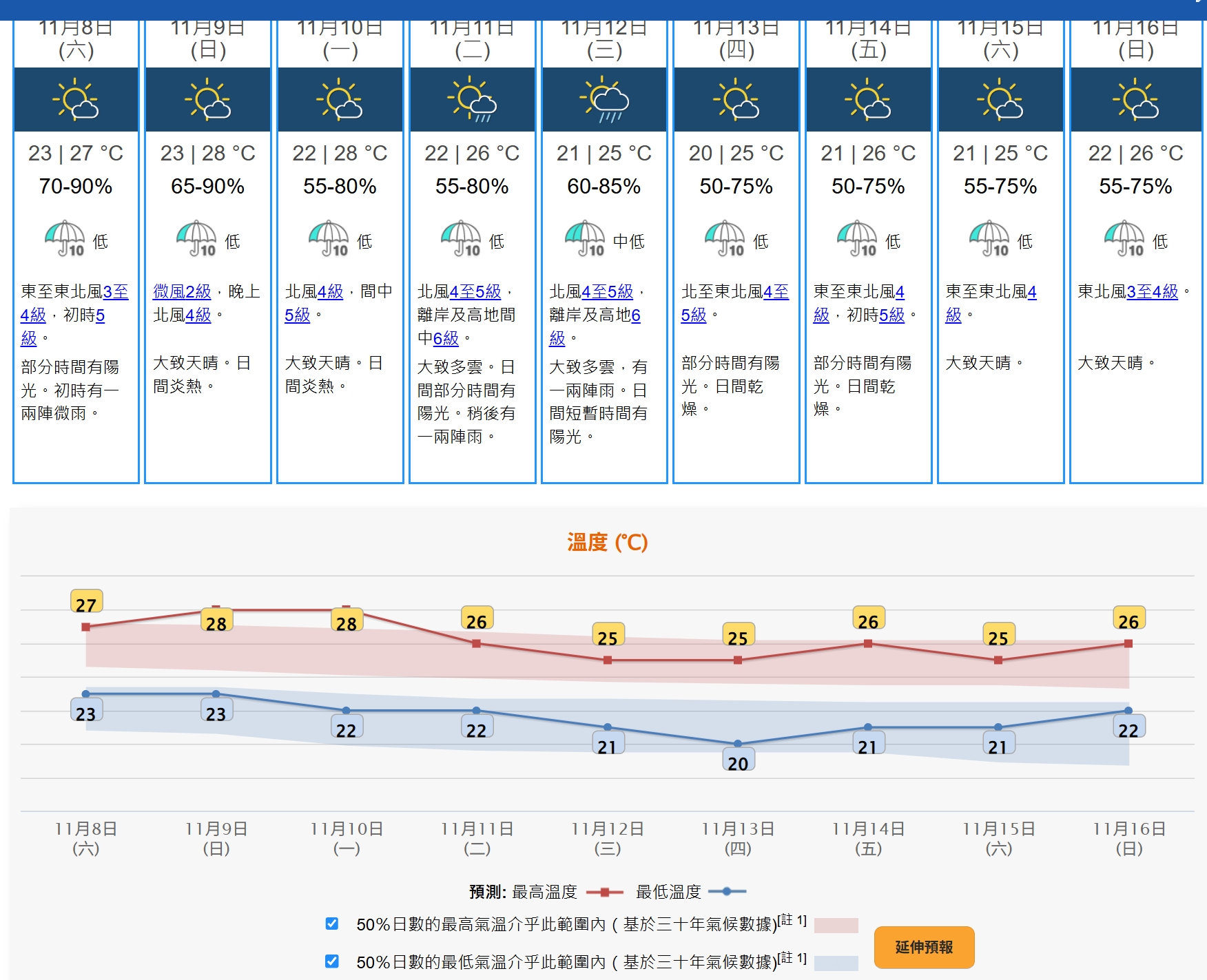 另外,天文台預計今午及今晚多雲,有一兩陣雨,吹清勁偏東風,初時離岸及高地吹強風,展望明日天色好轉,星期日及下星期一部分時間有陽光及炎熱,下星期二及下星期三風勢頗大,天氣稍涼。