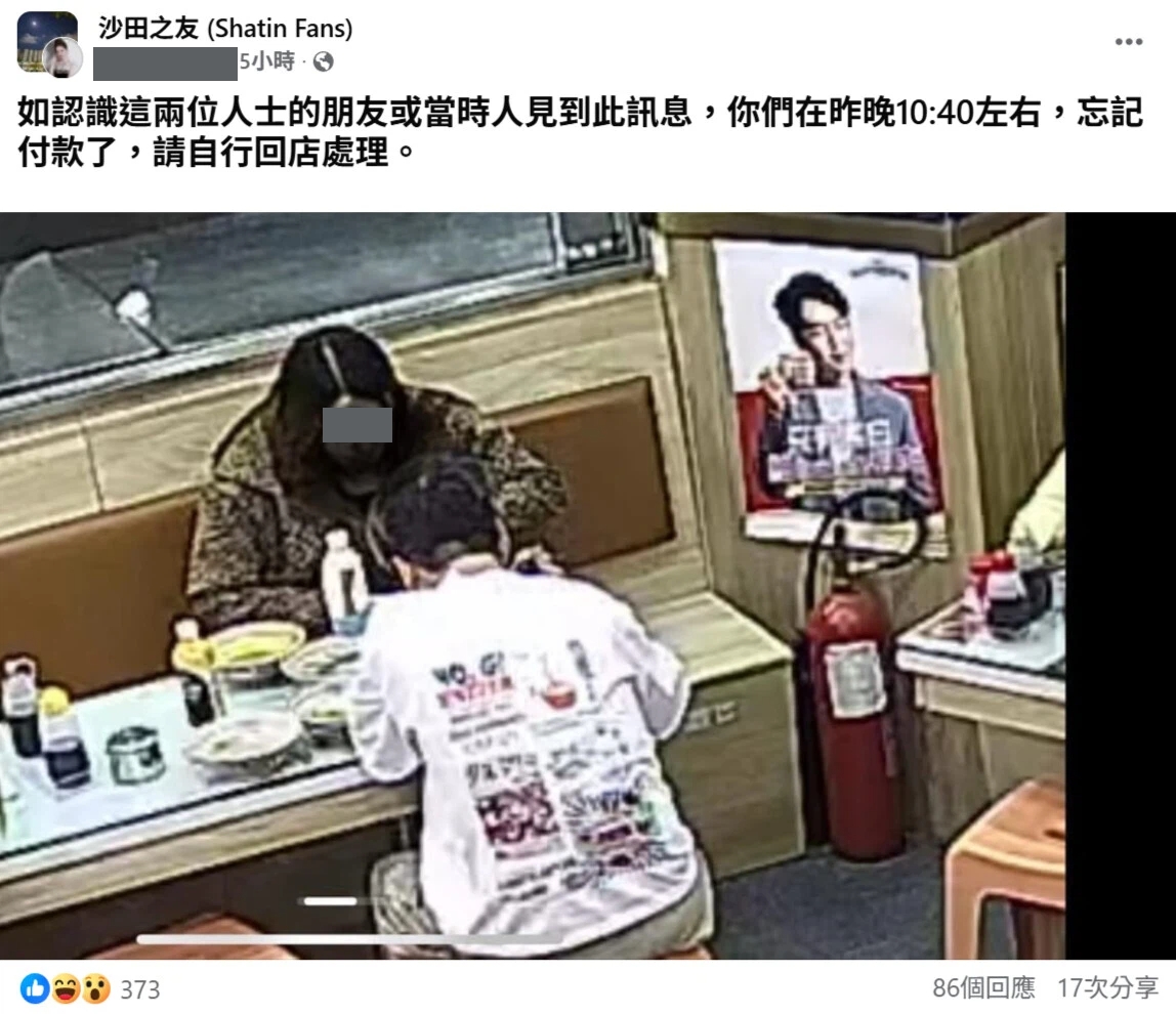 網上FB群組今天 (11月18日) 流傳一則帖子並且附上圖片,帖子表示「如認識這兩位人士的朋友或當時人見到此訊息,你們在昨晚10:40左右,忘記付款了,請自行回店處理」。