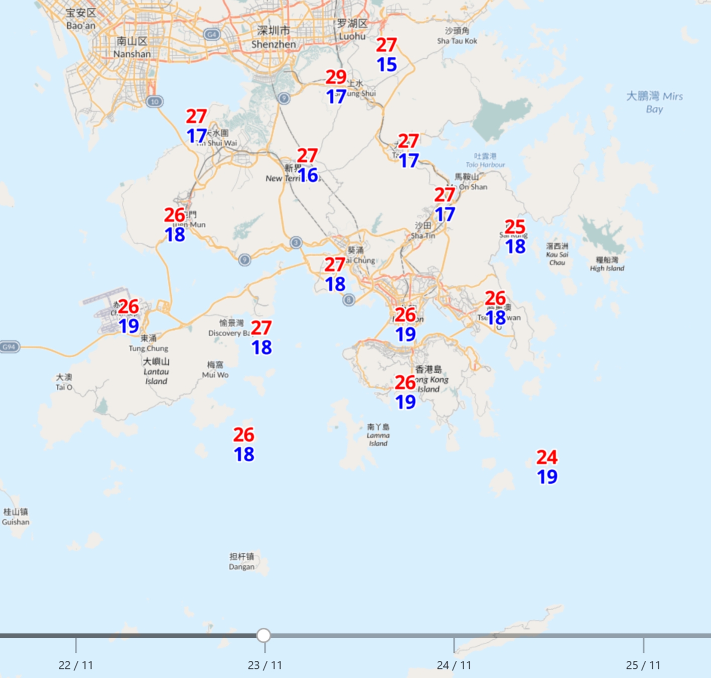 香港天文台今天 (11月21日) 表示,受乾燥的東北季候風持續影響,週末至下週初廣東天色大致良好,日間溫暖,日夜溫差頗大,預料季候風補充會在下星期一 (11月24日) 晚上至下星期二 (11月25日) 初時抵達華南沿岸,隨後兩三日該區早晚清涼,日間非常乾燥。