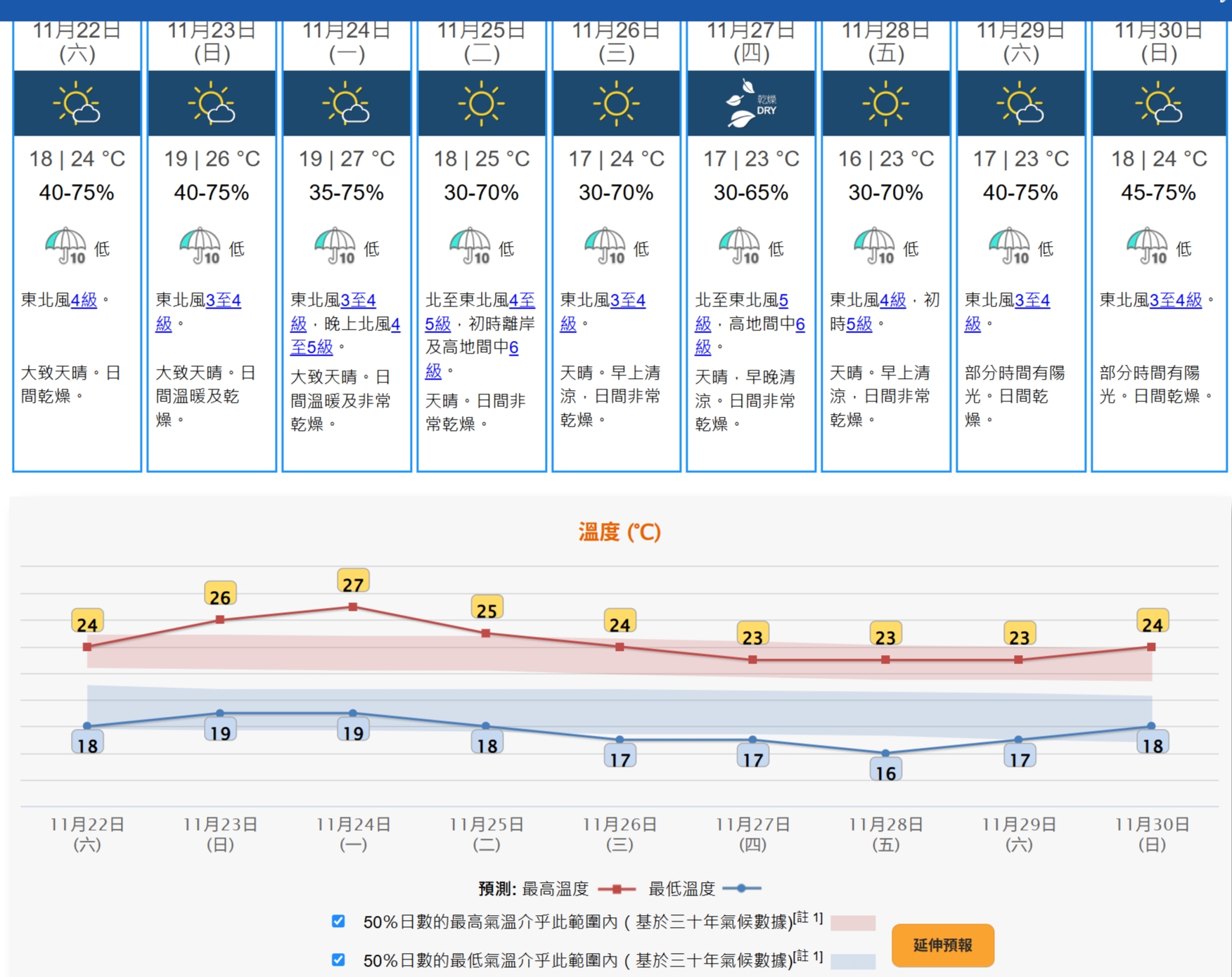 天文台預計,今天大致天晴,今午非常乾燥。吹和緩北至東北風,展望未來數日持續天晴乾燥,日夜溫差頗大,週末至下週初日間溫暖。下週中期早晚清涼。