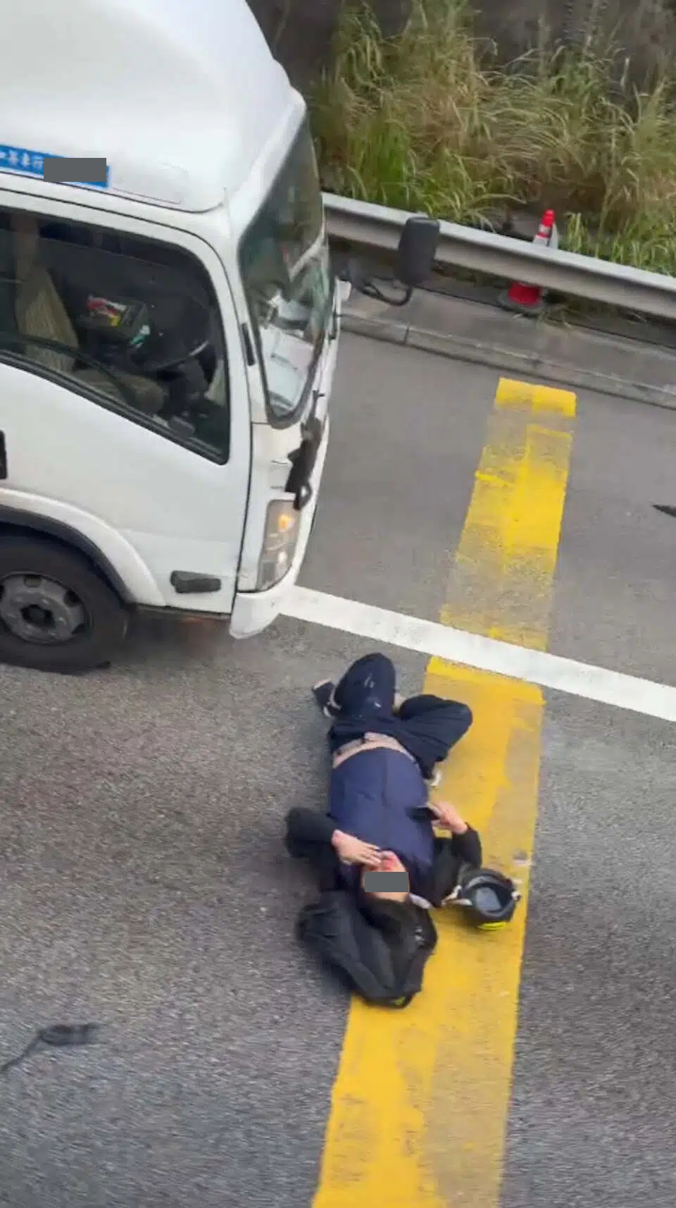 從網上FB群組視頻可見,路面遺下貨車的煞車痕,電單車鐵騎士倒臥在貨車車頭,口及鼻流血,痛苦萬分清醒瞓地待救,電單車的車尾箱及碎片散落一地,最前方則有一部私家車停下。