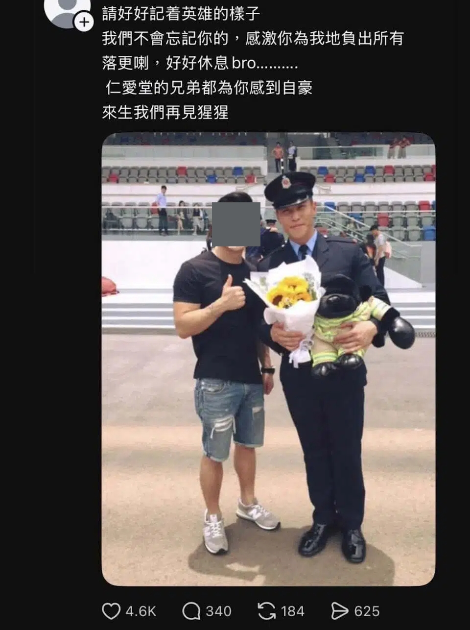 何偉豪的同袍昨晚在社交媒體發布兩人在何偉豪從消防學校畢業時的合照,以悼念戰友,指「我們不會忘記你的,感激你為我地負(付)出所有。落更喇,好好休息 bro......」,他又說一眾「兄弟」都會為他感到自豪。