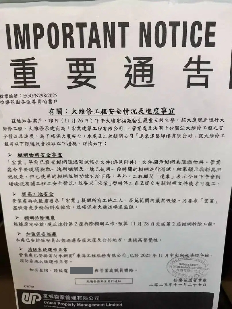 怡樂花園管業處於通告指出,承辦商「宏業建造工程有限公司」早前已提交棚網阻燃測試報告文件,文件顯示棚網為阻燃物料,管業處今早於現場檢取一塊新棚網及一塊已使用一段時間的棚網進行測試,結果顯示物料具阻燃效果,但已使用的棚網阻燃功效有所下降,而工程顧問「遠東建築師樓有限公司」也會到場檢視有關工程的安全情况,並要求「宏業建造工程有限公司」暫時停工直至提交有關證明文件後才可復工。