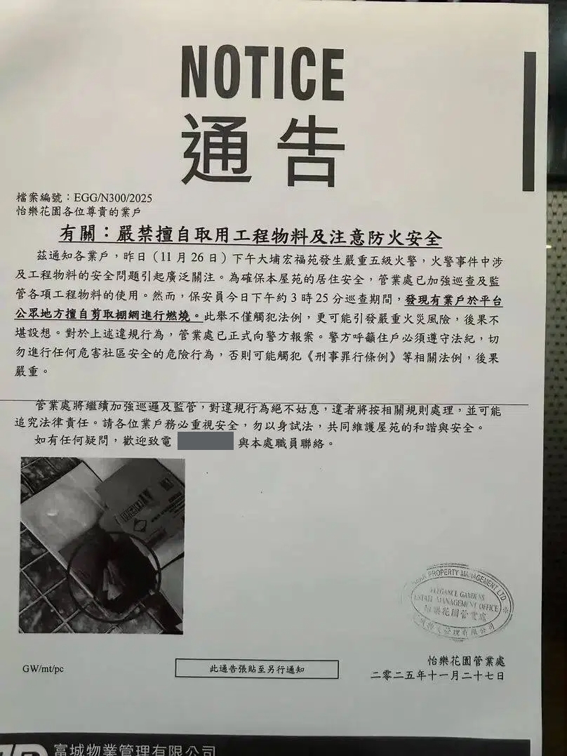 怡樂花園管業處:有住戶擅自剪取棚網燃燒已報警