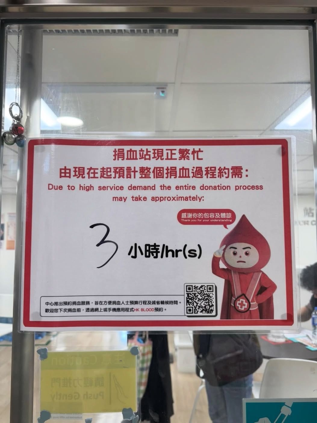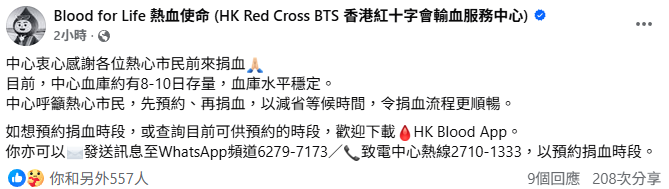 而香港紅十字會輸血服務中心在facebook社交專頁向市民呼籲:中心血庫約有8-10日存量,血庫水平穩定,並衷心感謝各位熱心市民前來捐血。同時建議熱心市民如有意捐血,可先預約、再捐血,以減省等候時間。