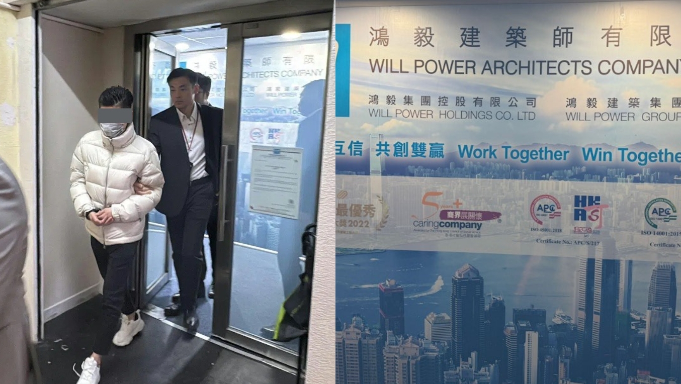 廉政公署昨日 (11月27日) 成立專案小組,就大埔宏福苑大維修工程可能涉貪展開調查,廉政公署今日(11月28日)拘捕工程顧問公司「鴻毅建築師」的2名負責人,並於今早曾把其中1名男子押至九龍灣福康工業大廈的寫字樓搜證。
