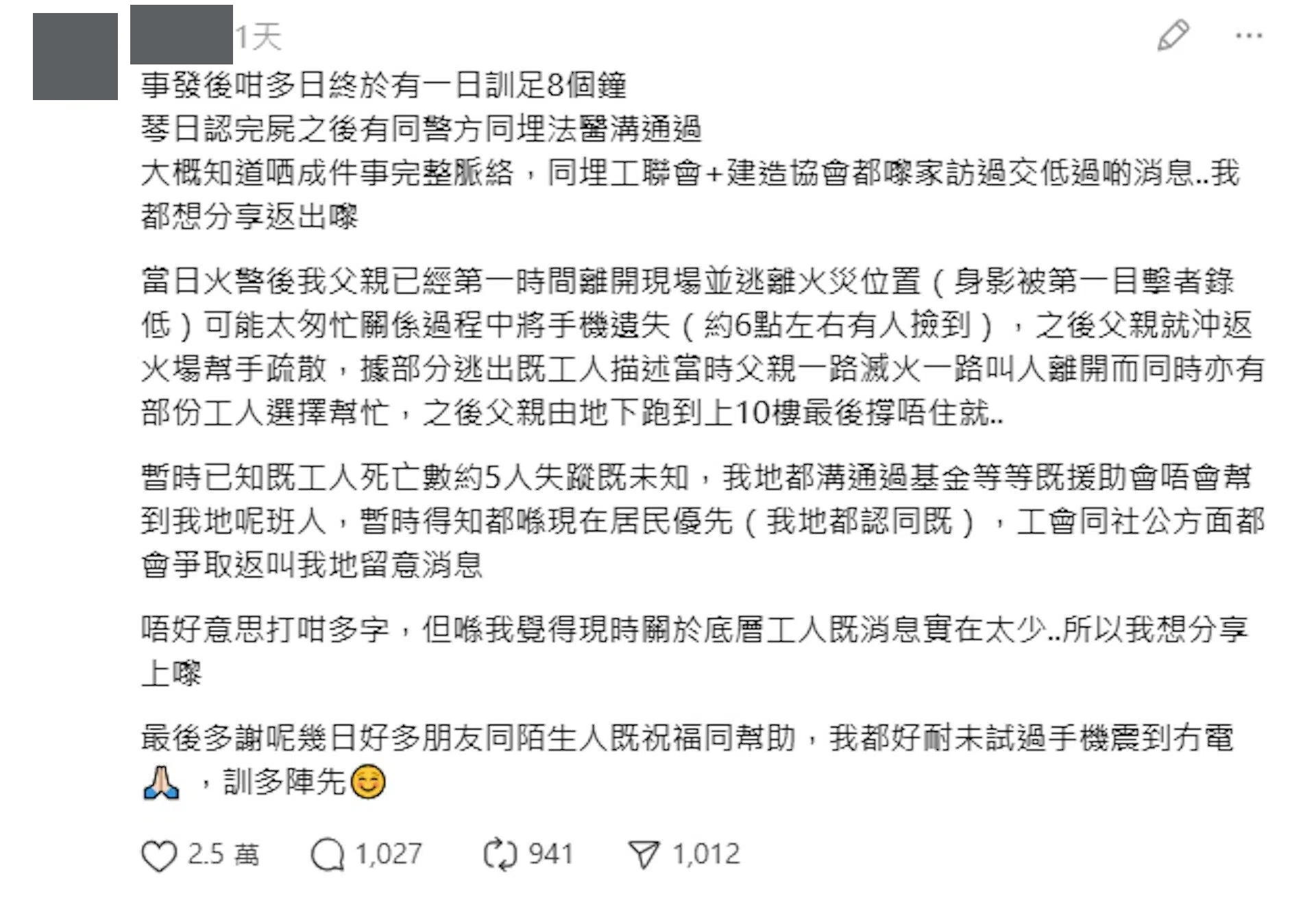 賴先生兒子在網上發帖,引述逃出生天的工人指出,其爸爸一邊滅火,一邊叫人離開,亦有部分工人選擇一齊幫忙,不幸地其爸爸由地下跑上10樓後遇難,並且指出其爸爸是家庭經濟支柱,目前很多資助都是提供予宏福苑居民,對工人的支援較少,但他時多謝工會等各方,盡量為工人提供幫助。![]()