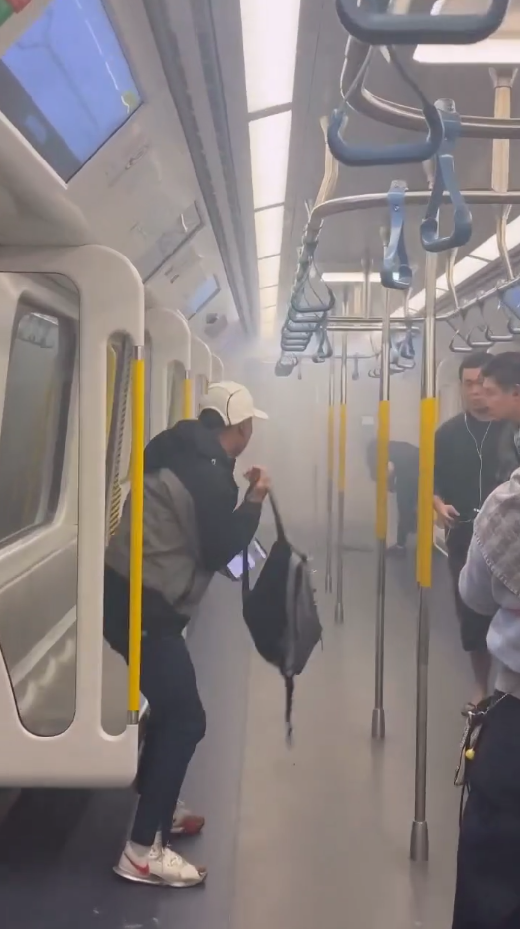 根據網上社交平台FB流傳的片段可見,當時車廂內的廣播指列車正駛入金鐘站。事發時涉事車廂內充斥大量白煙,可見一名女子把涉事「尿袋」放在地上,一名男乘客見狀上前協助;而其他乘客則掩鼻四散離開。