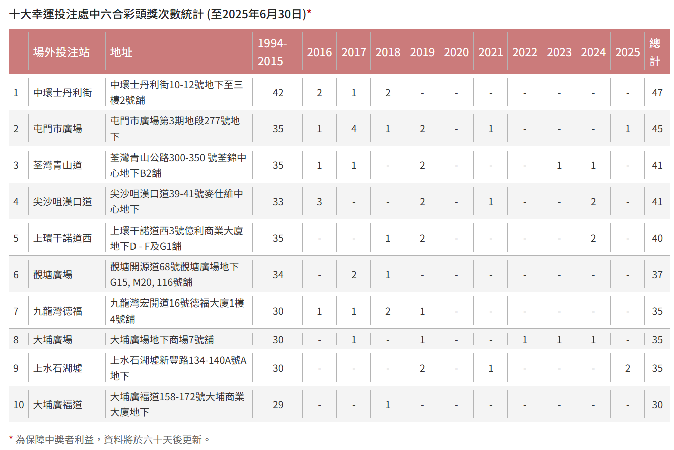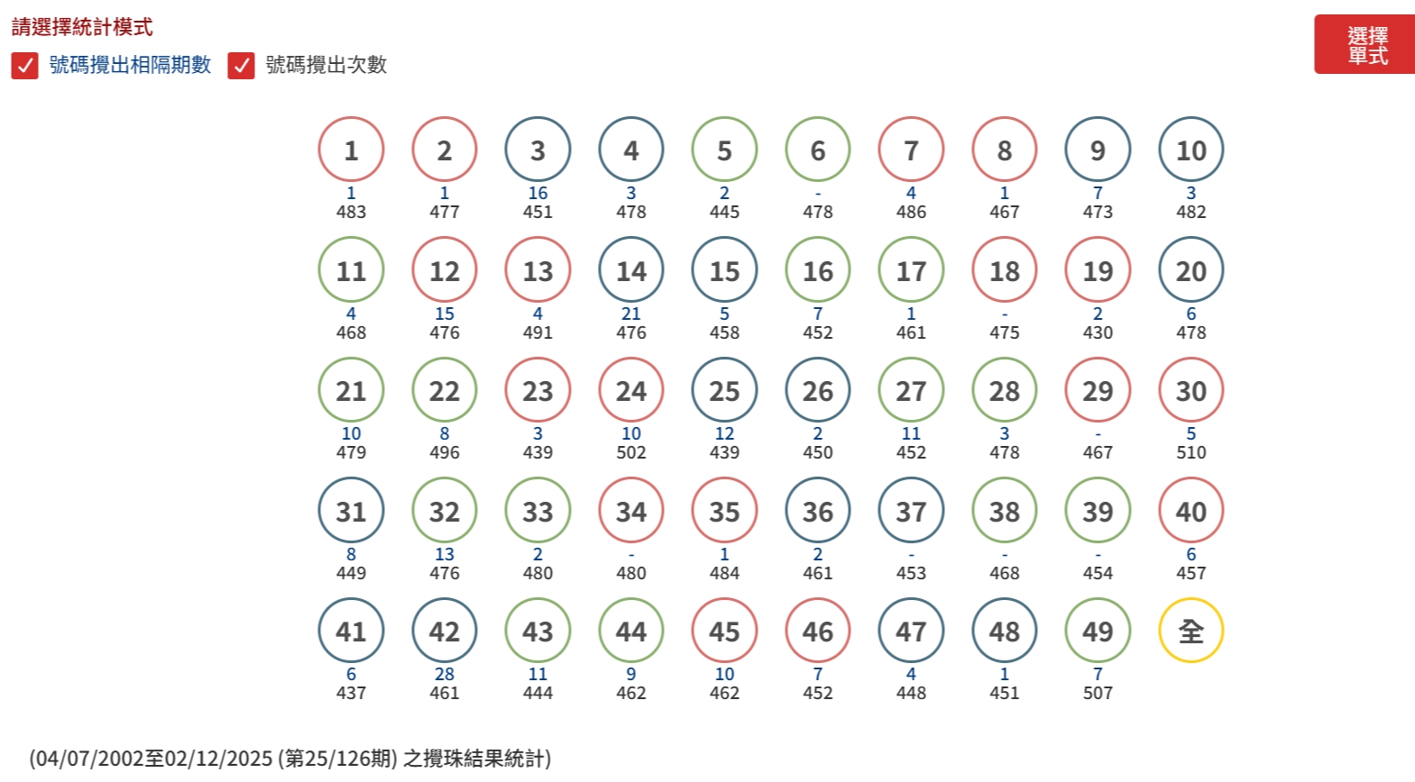 根據香港賽馬會最新的六合彩攪珠統計數字顯示,由04/07/2002至2/12/2025為止, 攪出最多的號碼是30號 (510次)、49號 (507次)、24號 (502次)、22號 ( 496次)、13號 (491次) 和7號 ( 486次) 。