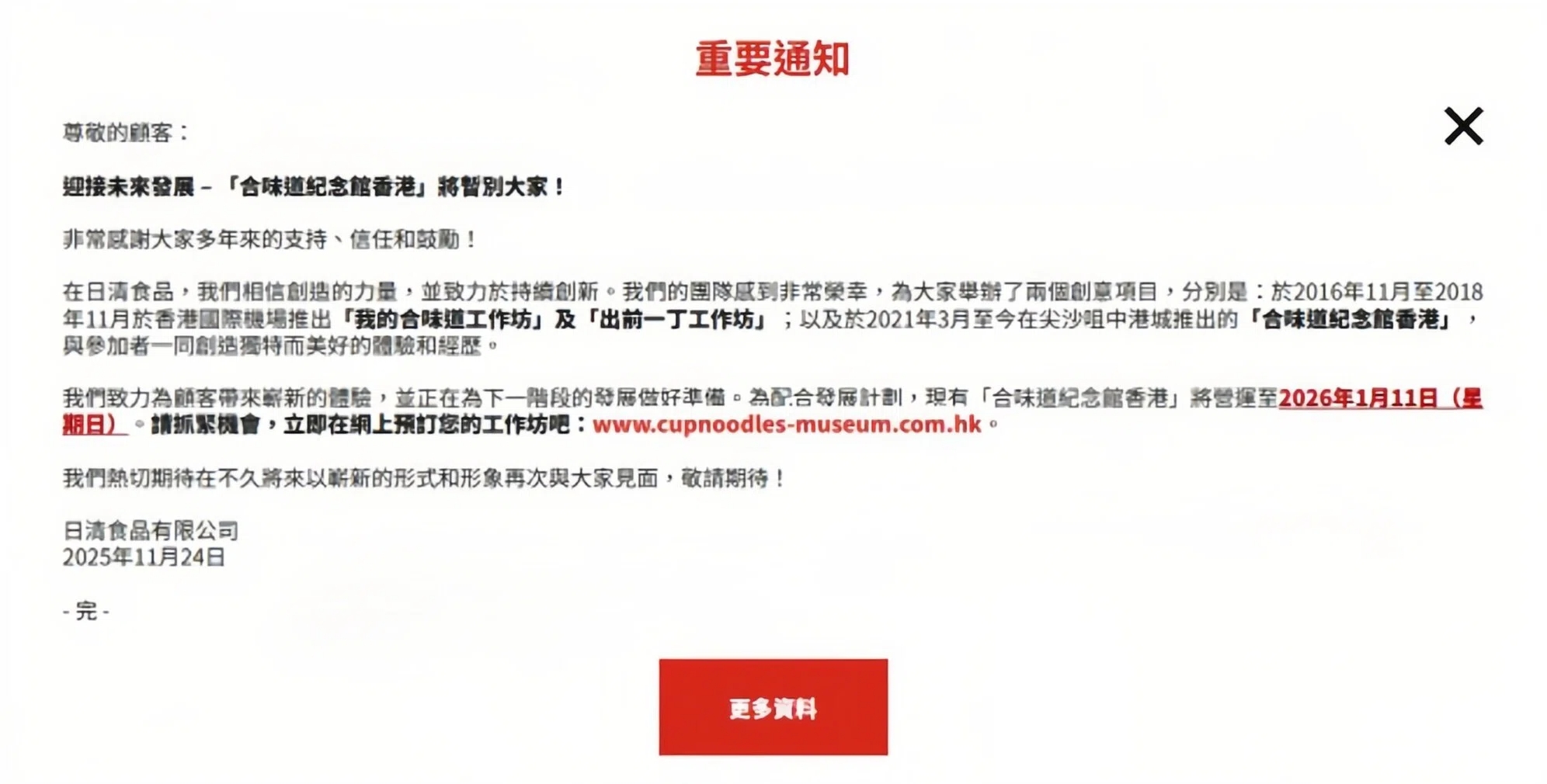 日清食品在合味道紀念館香港的官方網站上發布「迎接未來發展 –『合味道紀念館香港』將暫別大家!」的公告,宣布位於尖沙咀的合味道紀念館將營運至2026年1月11日,並且表示為下一階段發展做準備。