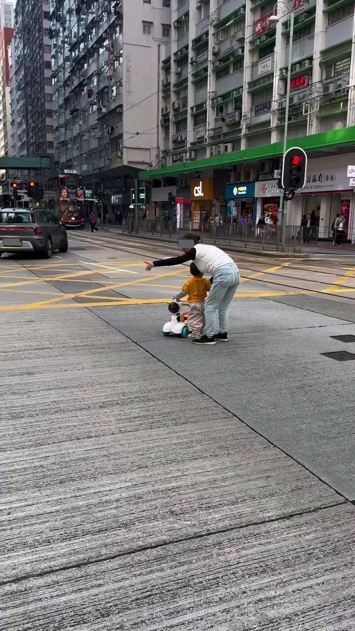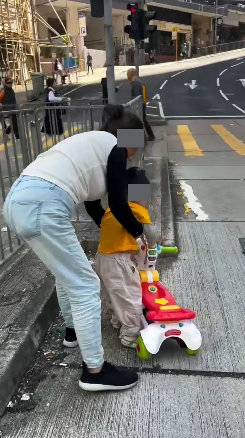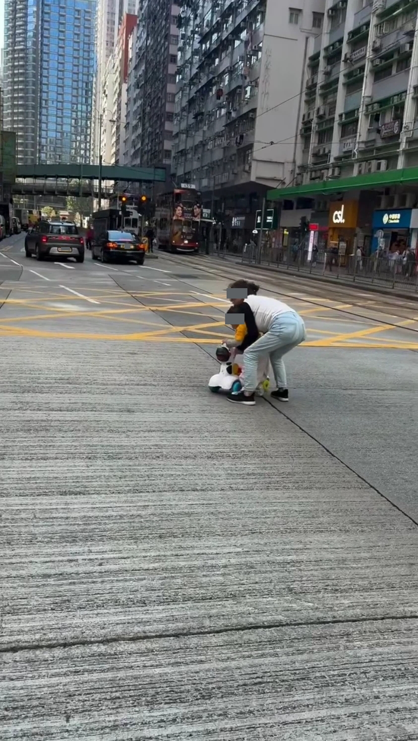 該視頻中可見一名外傭白天在英皇道的十字路口,沒有使用斑馬線扶住踩著四輪車的幼童,慢慢在馬路上前進,而當時有不少車輛正等紅燈,後來外傭見小孩不肯前行,當時見行車燈號快要轉綠燈,於是急急連人帶車抱起小孩,跑到行人路邊,正在駕車的男旁白也不禁大叫「小心呀姐姐,BB呀」,影片到此結束。
