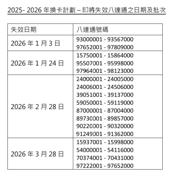 八達通公司最新公布第23、24、25、26批八達通卡將於2026年1月3日起陸續失效,如果屆時使用八達通時出現「嘟~嘟嘟」3下聲響,可能表示你的八達通卡需要更換,不則3個月後或會失效。