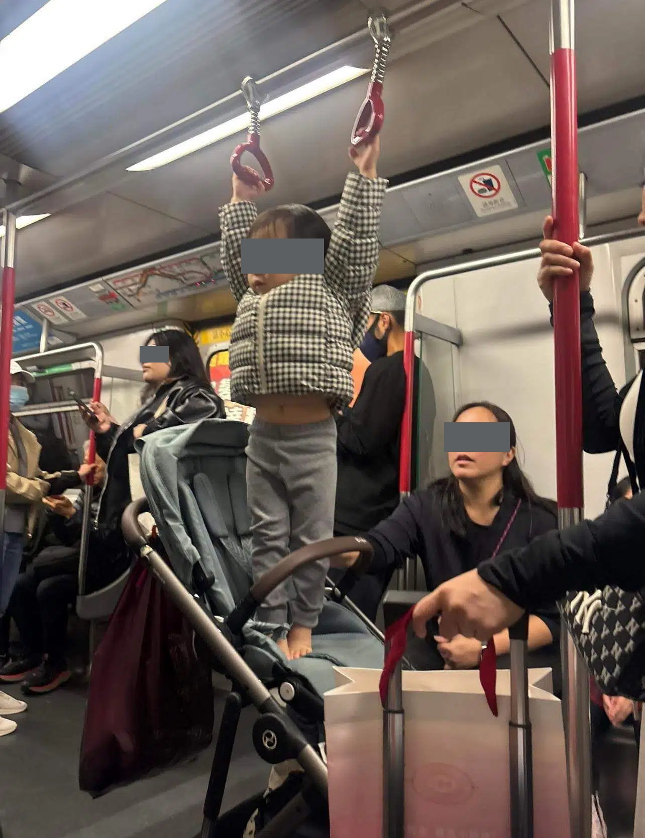 圖片中可見在一個滿座的港鐵車廂內,驚見一名赤腳幼童危企於BB車的座位上,伸盡雙手掛在車頂的扶手吊環,整個人幾乎懸空,隨時跌倒地上,而其家長竟然只是旁觀而未有制止幼童的危險行為。