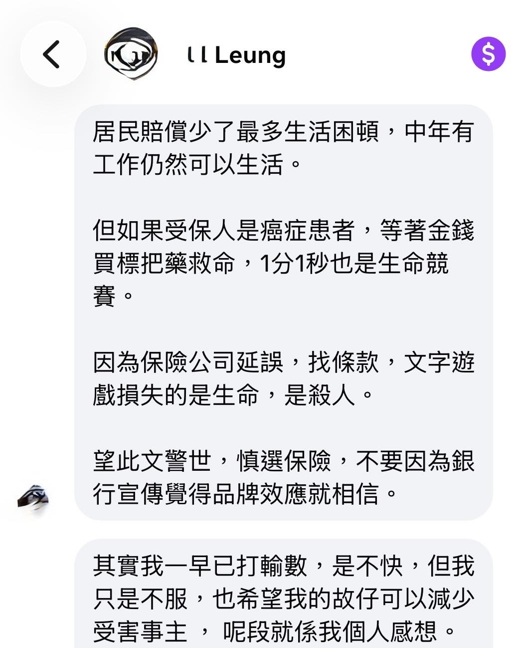 不過,不是人人可以體會到災民心情。日前,有社交平台專頁「程總裁在國金89樓」」刊登了長文,事主是關於一位宏福苑宏泰閣的梁小姐,據長文引述,有間保險公司以「精神虐待」方式去處理的家居保險索償。